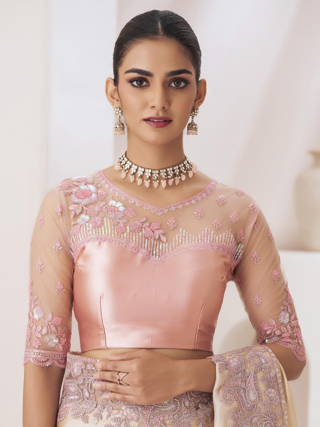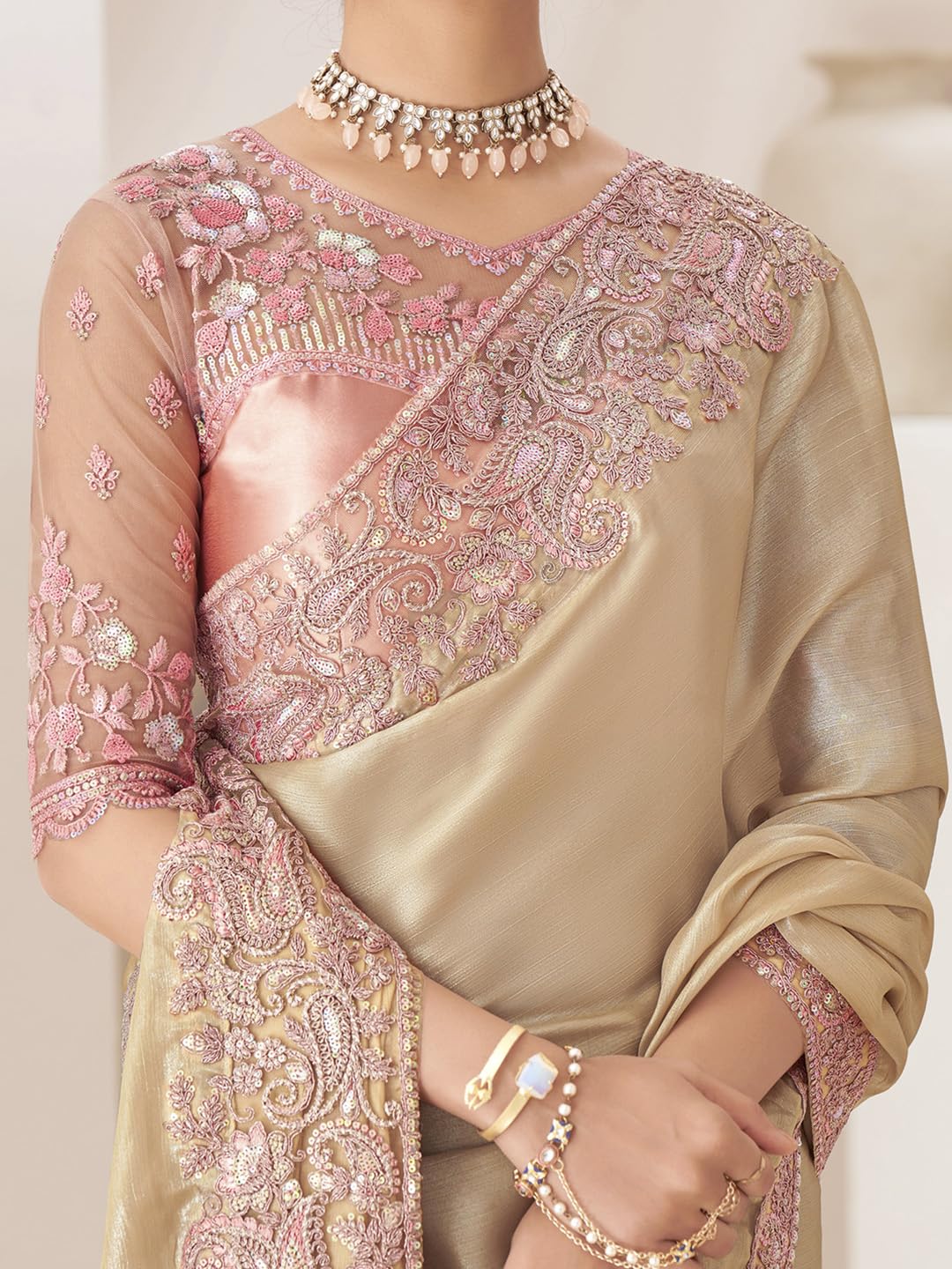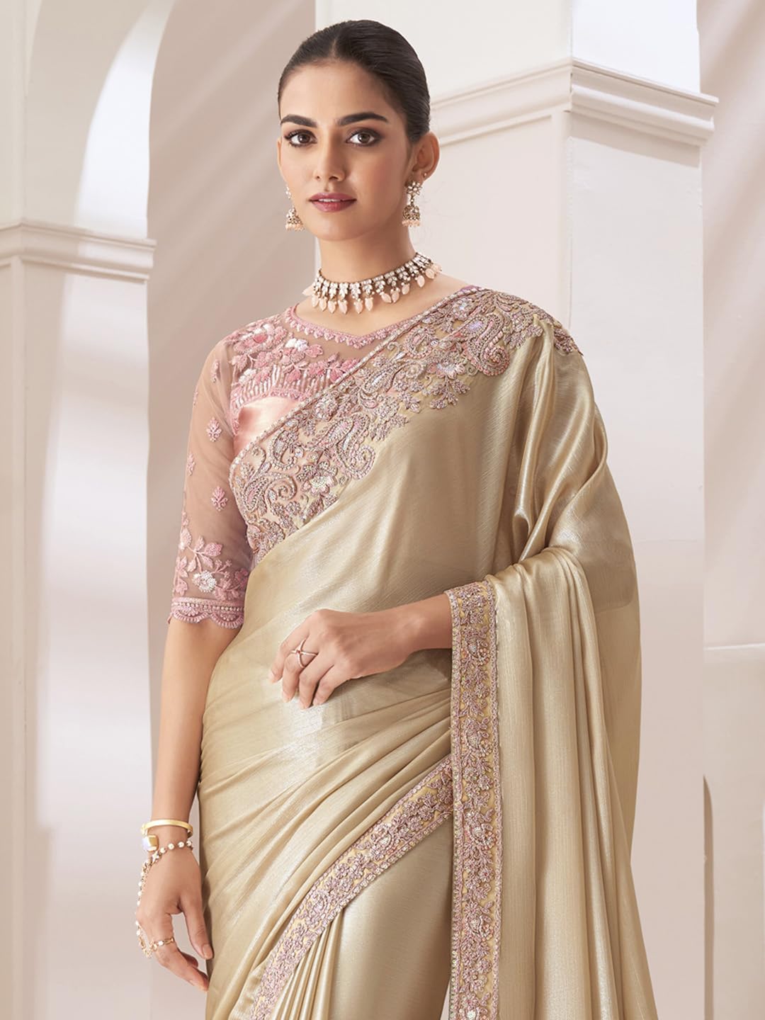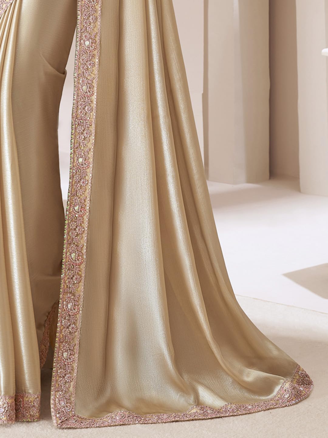 AKHILAM Women's Cream Pure Chiffon Embellished Saree With Unstitched Blouse (SNDLWOD1303_TFH)