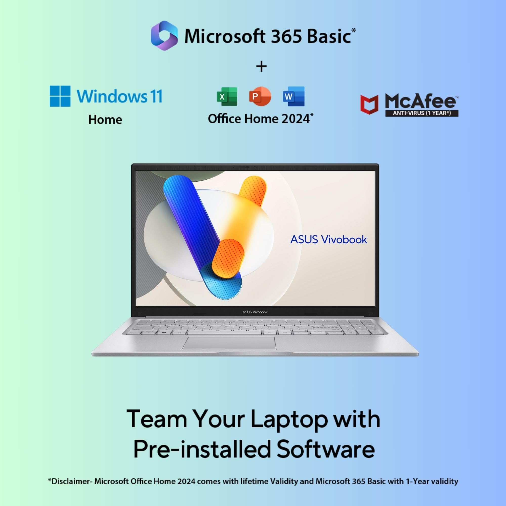 ASUS Vivobook 15, Intel Core i3 13th Gen 1315U, 12GB RAM, 512GB SSD, FHD 15.6", Windows 11, Office Home 2024, Cool Silver, 1.7Kg, X1504VA-BQ331WS, Intel UHD iGPU, Thin & Light, 42Whrs Laptop