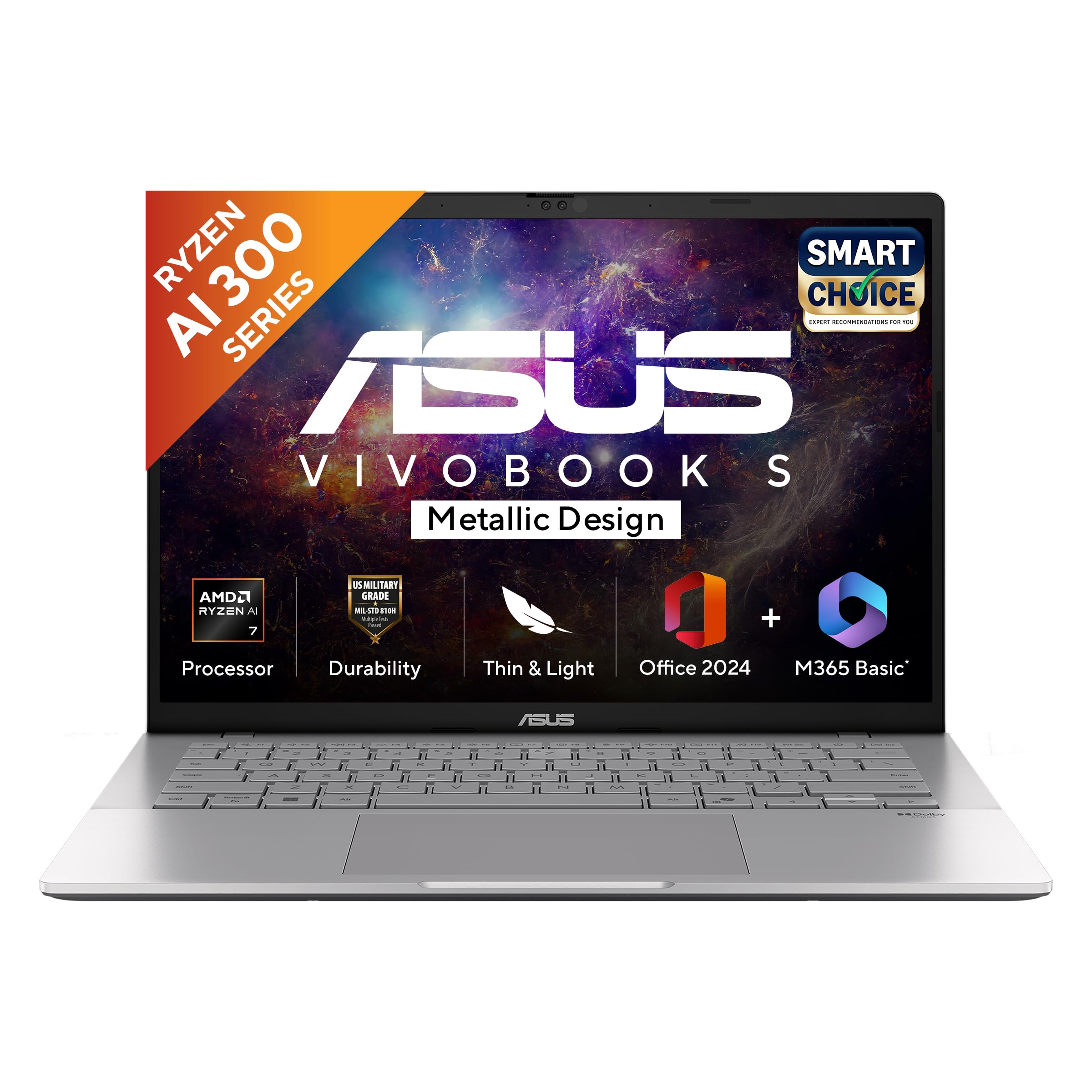 ASUS Vivobook S14, Smartchoice, AMD Ryzen AI 5 330, 16GB RAM, 512GB SSD,FHD+ 14", Win11, Office 2024,M365 Basic (1Year),Cool Silver, 1.4Kg, M3407KA-SF2501WS, 50 TOPS, Metallic Design Copilot AI Laptop