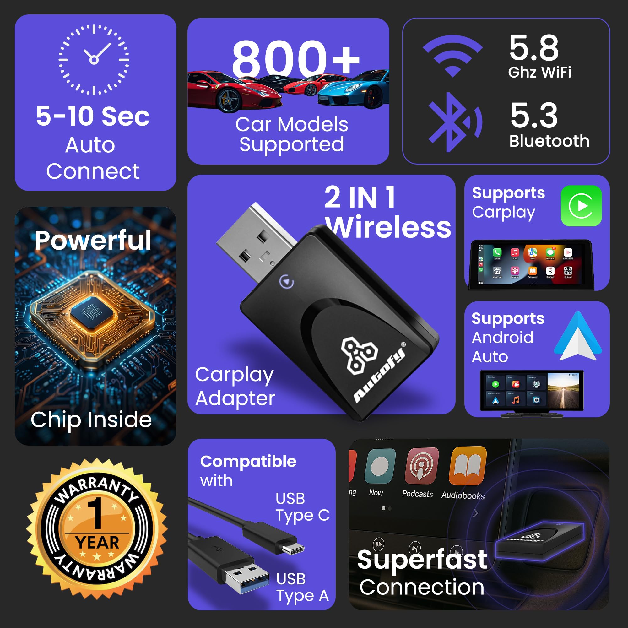 Autofy [SEP 2025 New Launch K1 Wireless Carplay Adapter & Android Auto Wireless Adapter Car Accessories Auto Reconnect Converts Wired-to-Wireless Carplay Android Auto for USB Type A &Type C