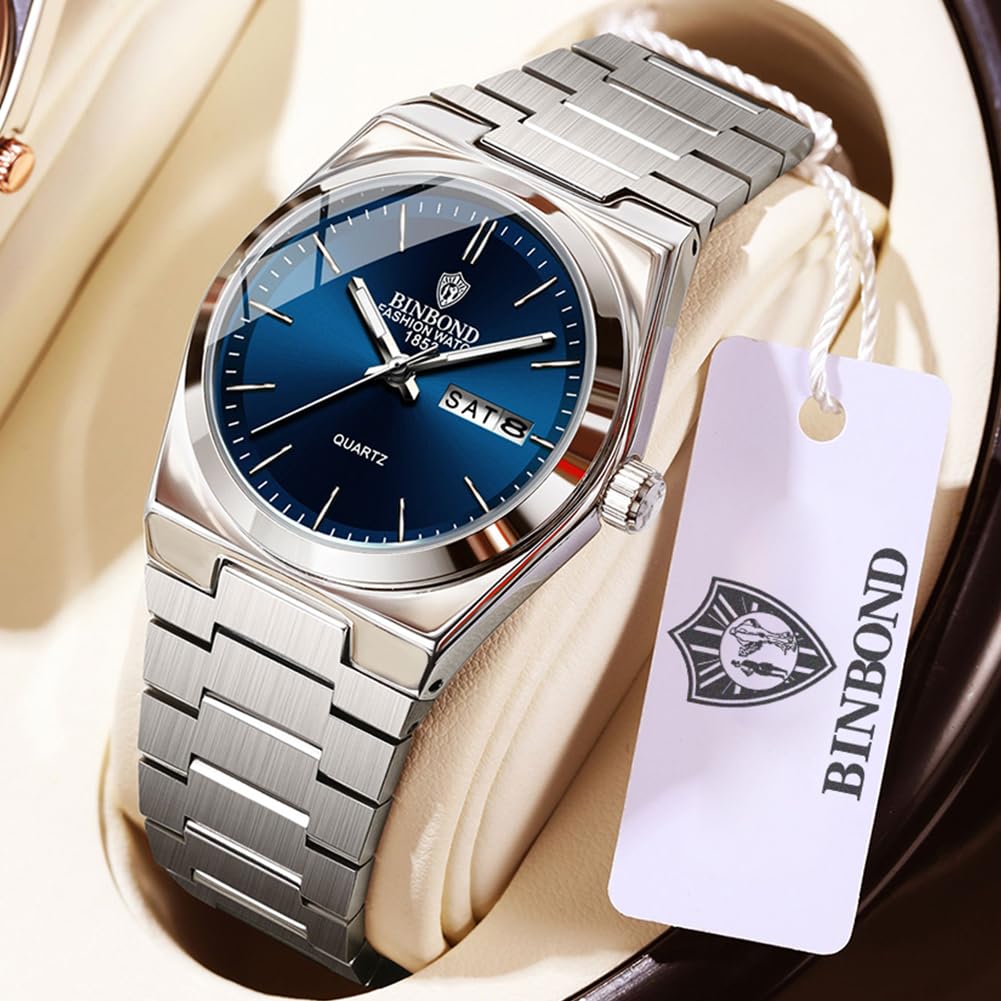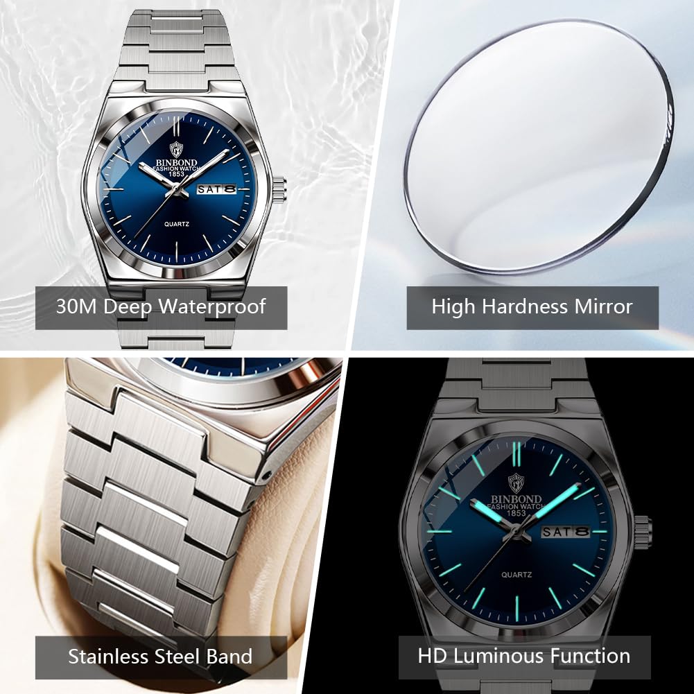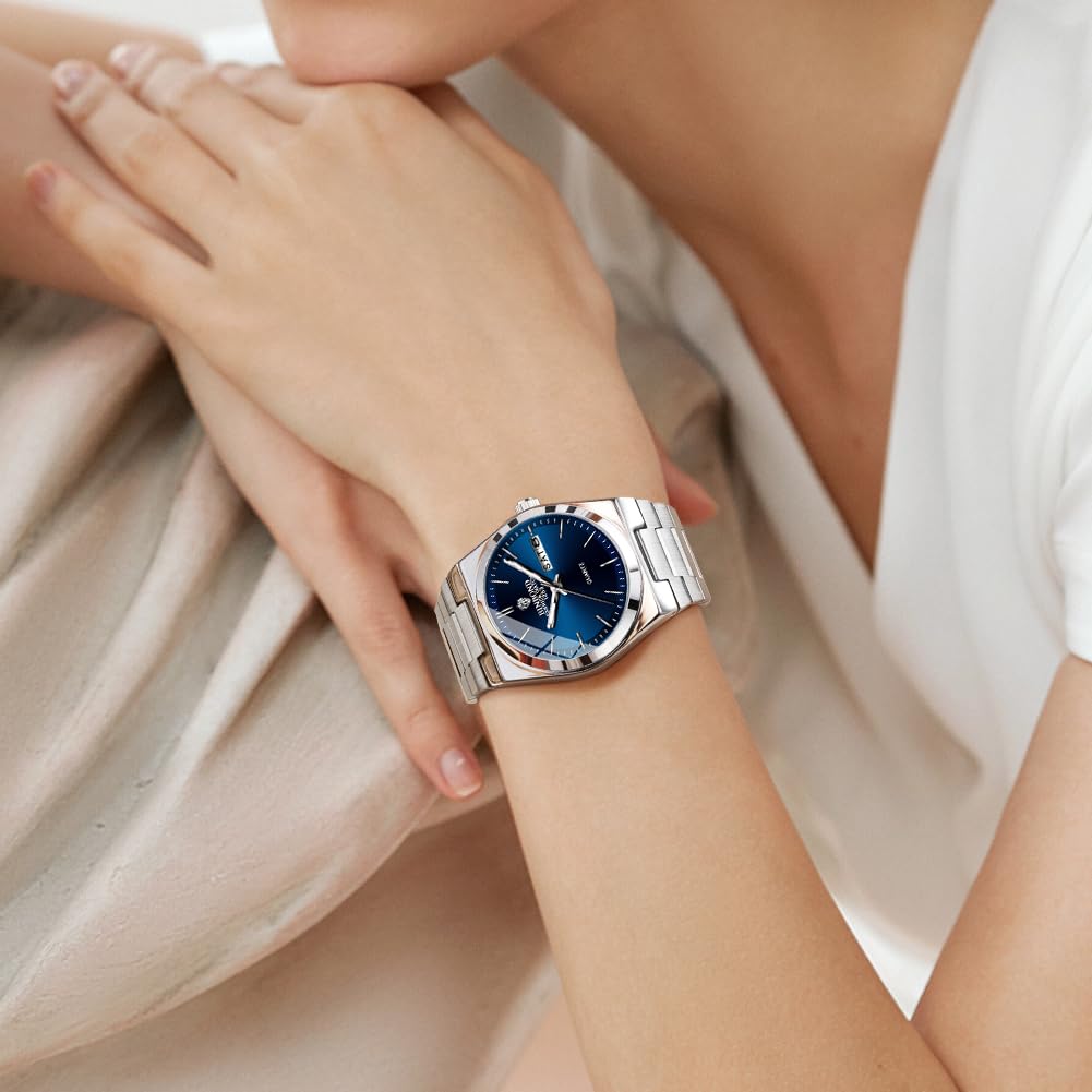 BINBOND Women's Watches Blue Dial with Date Stylish Dress Stainless Steel Analog Quartz Luxury Elegant Ladies Wrist Watch for Girls&Miss Waterproof Luminous