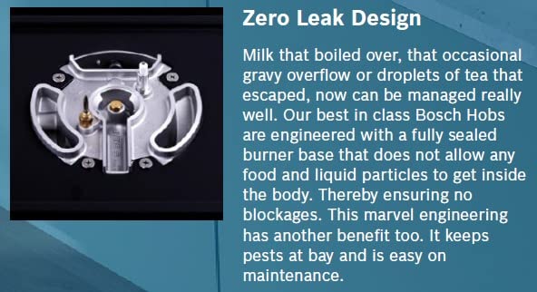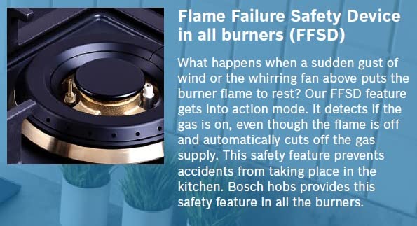 Brand: BoschColor: BlackFeatures: Glass gas hob,Sword Knobs,Auto Ignition,Tempered glass,Stainless steel heat Shields,Flame Failure Safety device ( FFSD),Enameled pan supports,Sword Knobs... Read more