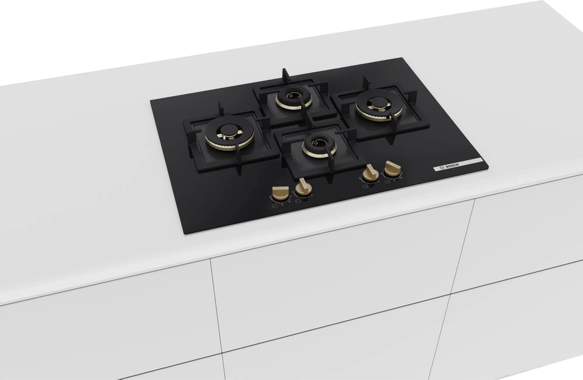 Bosch Built in Gas Hob Black Tempered glass Glass 4 Burner Auto Ignition 75 cm Full Brass 3D Ring Burners with Matt Black Heat Shields & Cast Iron pan supports (PNI7B6G20I)