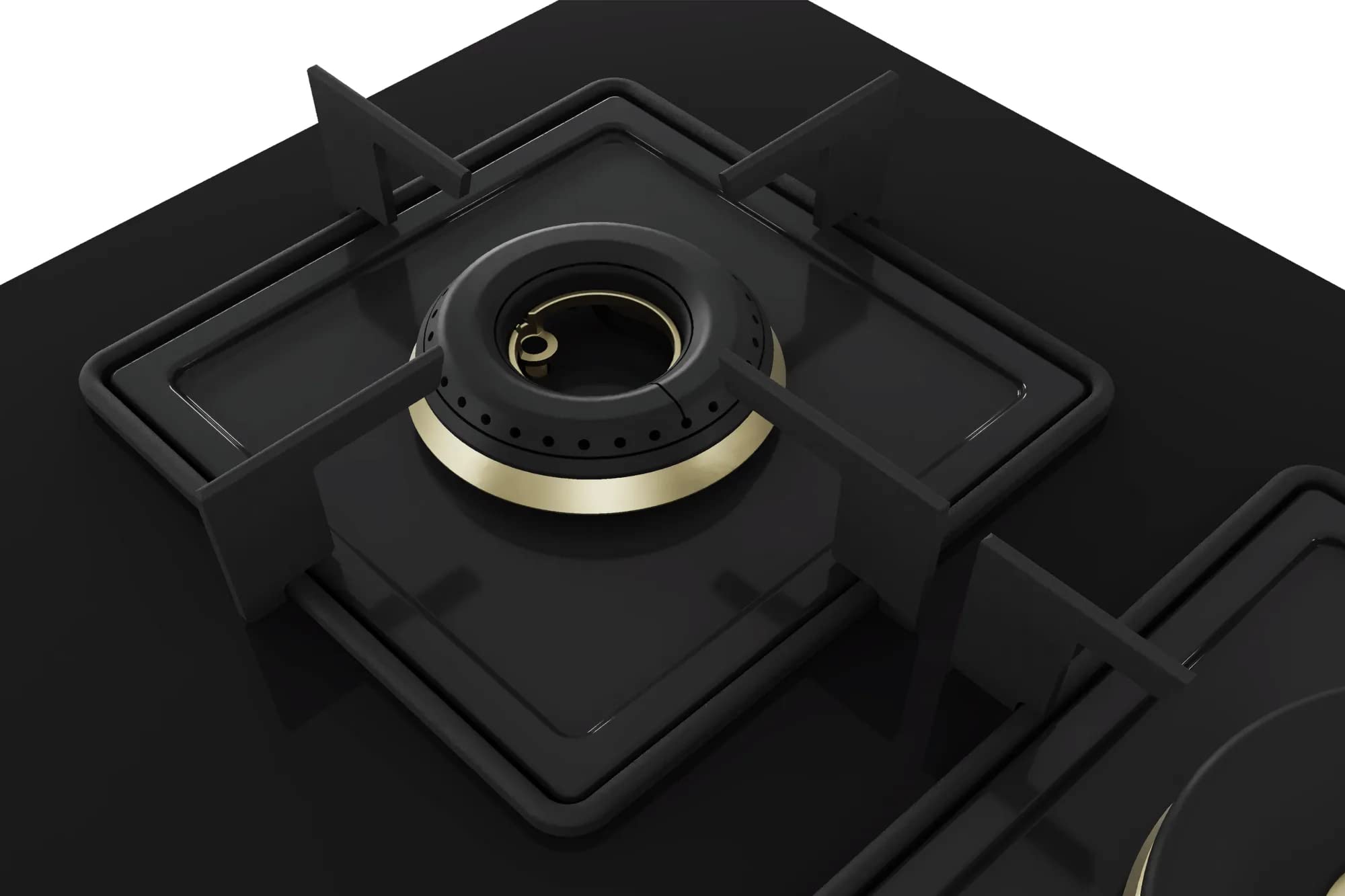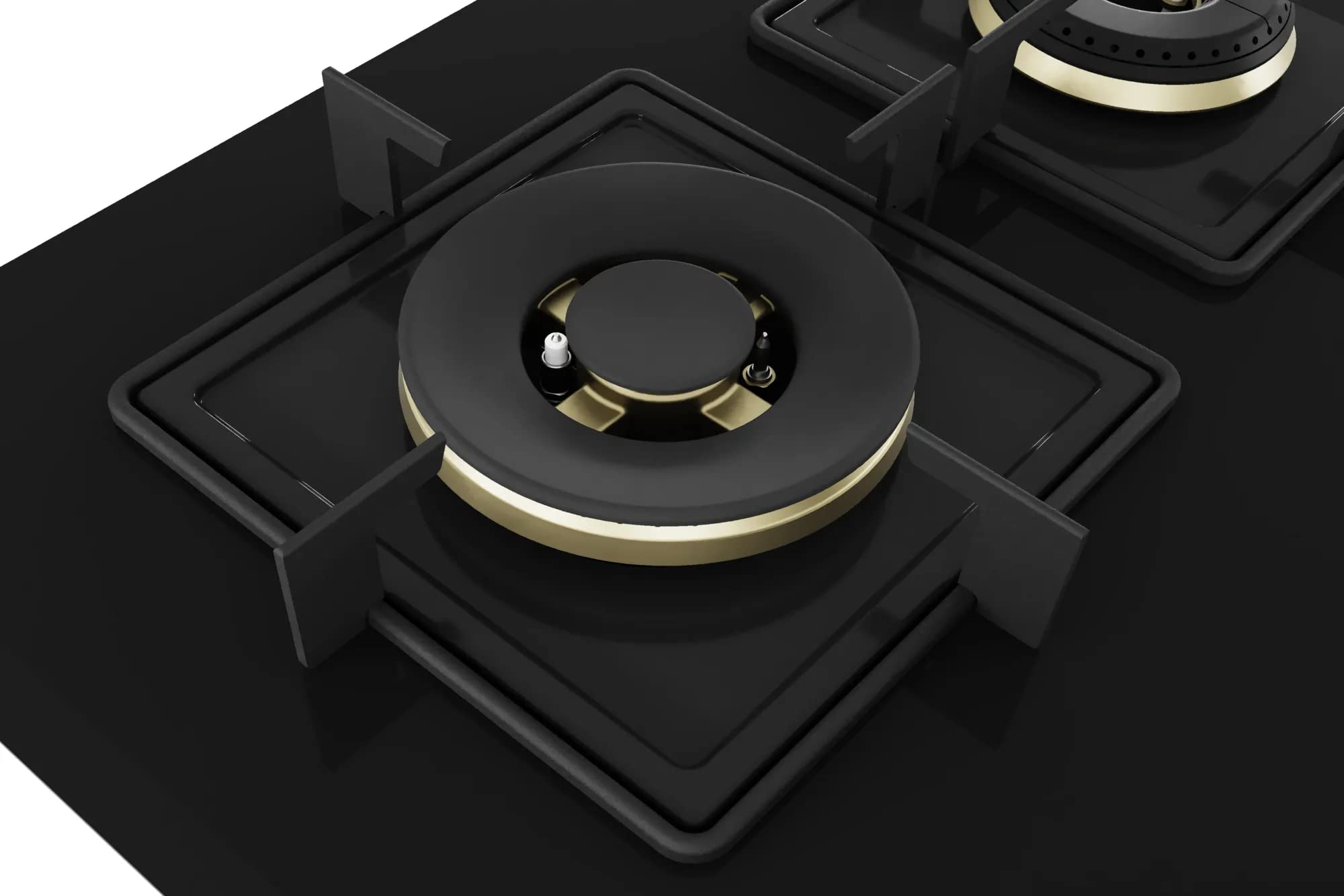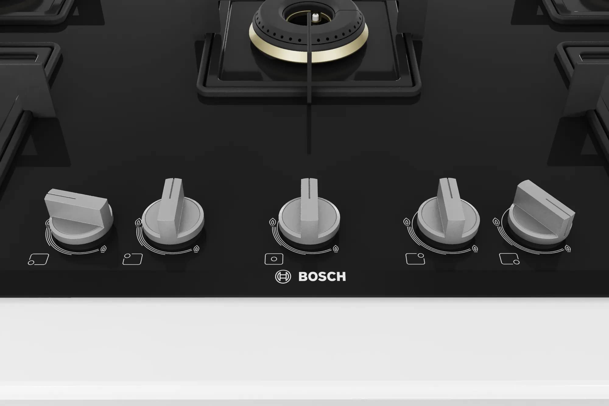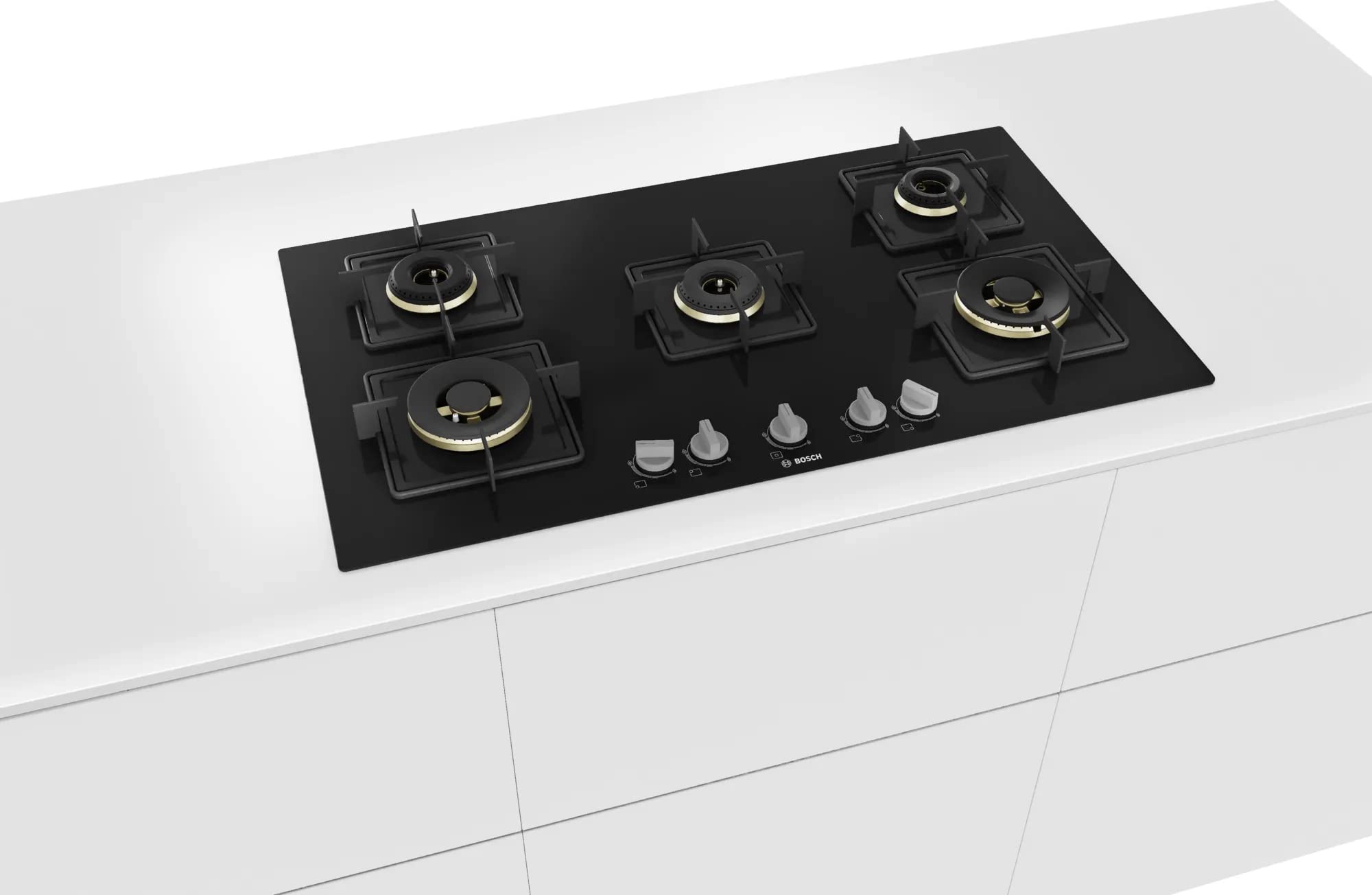 Bosch Built in Gas Hob Black Tempered glass Glass 5 Burner Auto Ignition 90 cm True Brass 2D Ring Burners with Glossy Black Heat Shields & Enameld pan supports (PNV9B6F10I)