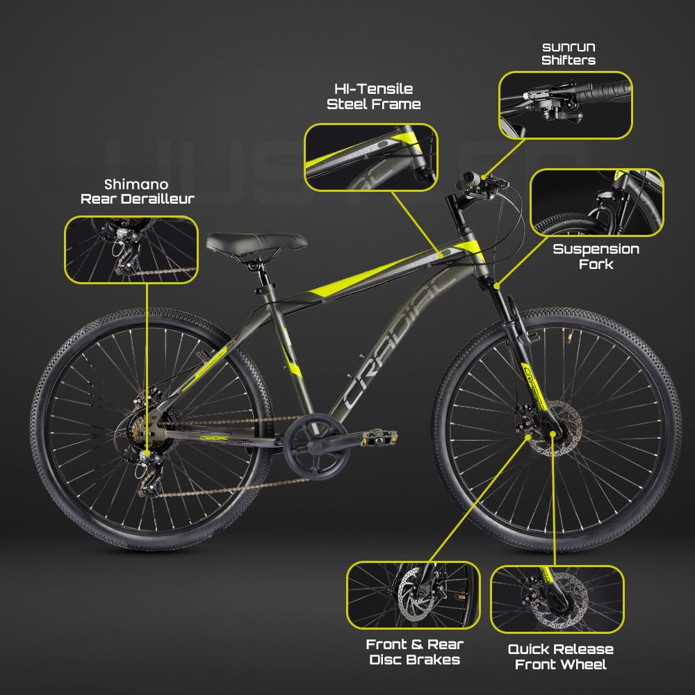 Brand: CRADIACColor: GREY/GREENFeatures: Hitensile steel frame 26" Inch MTB 7 speed gear cycle Dual Disc Brake Unisex Mountain bike model... Read more