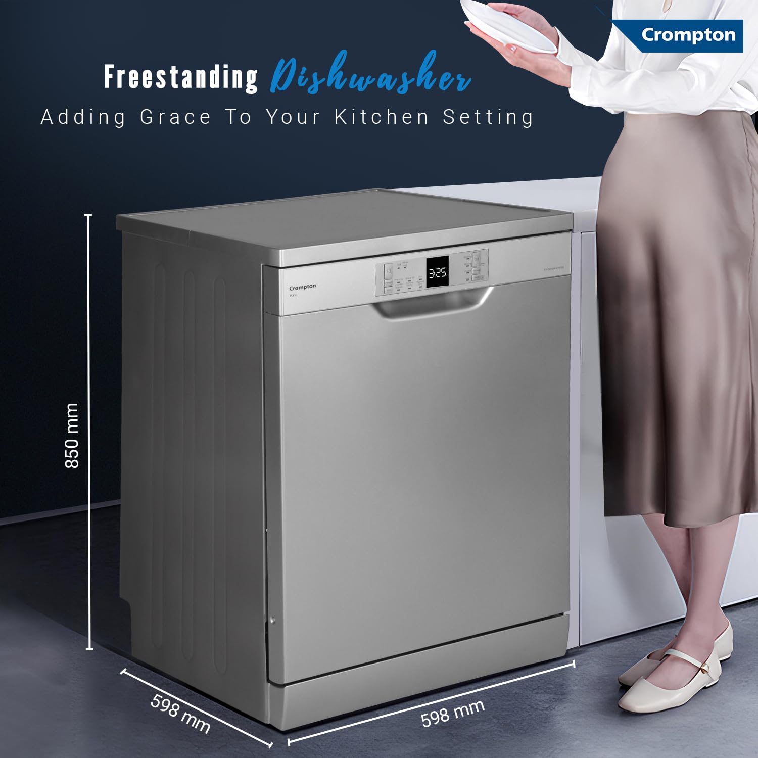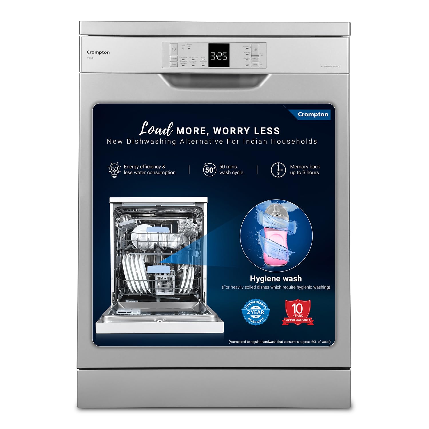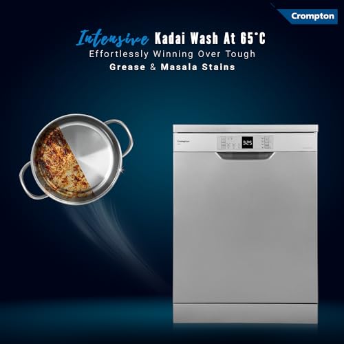 Crompton 14 Place Setting Freestanding Dishwasher with 6 Wash Programs and Super Active Drying System | Energy Saving Dishwasher with Stainless Steel Tub (Voilla 14 PS DW, Silver Inox,FS-DWVOA14PS-DS)
