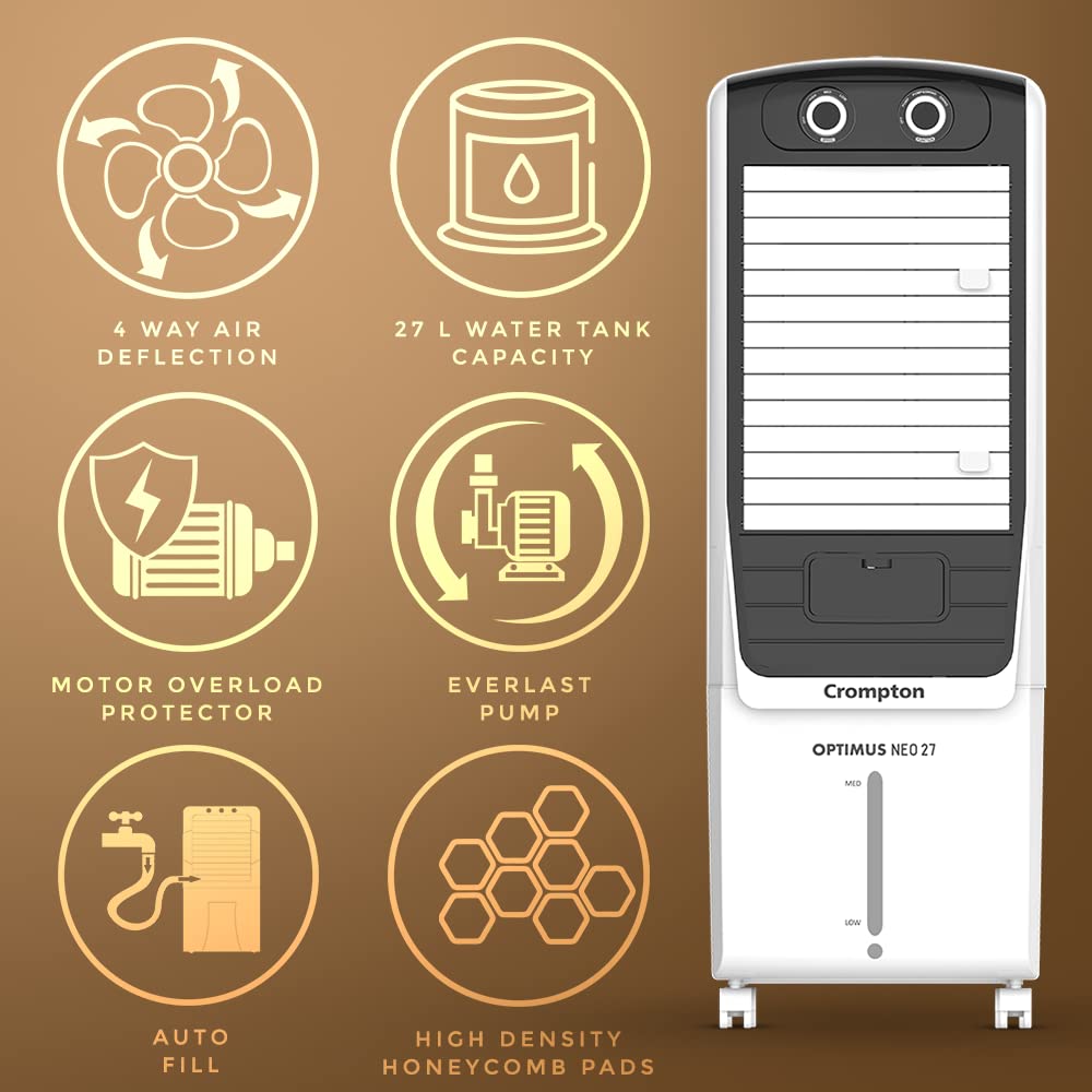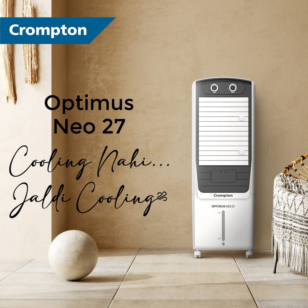 Crompton Optimus Neo 27 Litres Tower Air Cooler for home | Easy Clean Ice Chamber | 4-Way Air Deflection | High Density Honeycomb Pads | Everlast Pump | Inverter Compatible