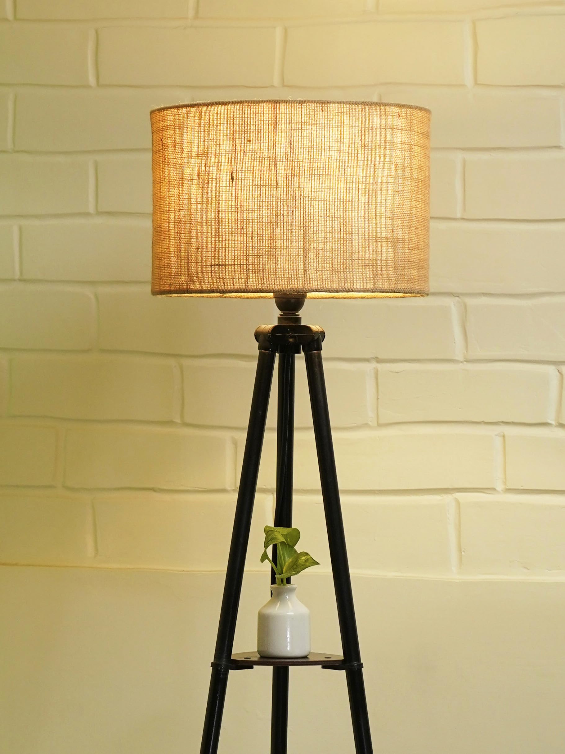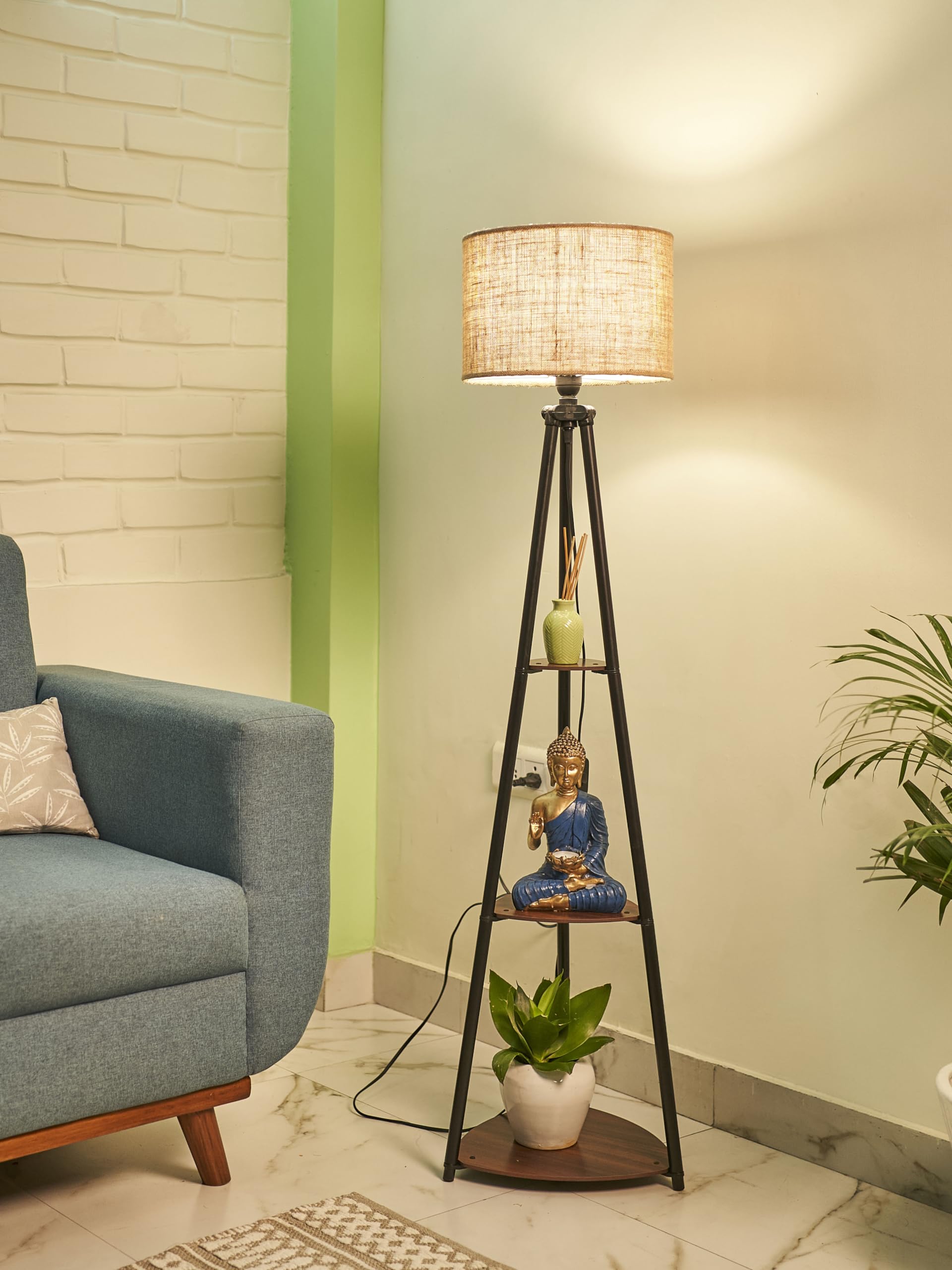 Brand: Crosscut FurnitureColor: Brown JuteFeatures: Decorative metal floor lamp with three wooden shelves and multipurpose lamp stand, Best for gifting... Read more
