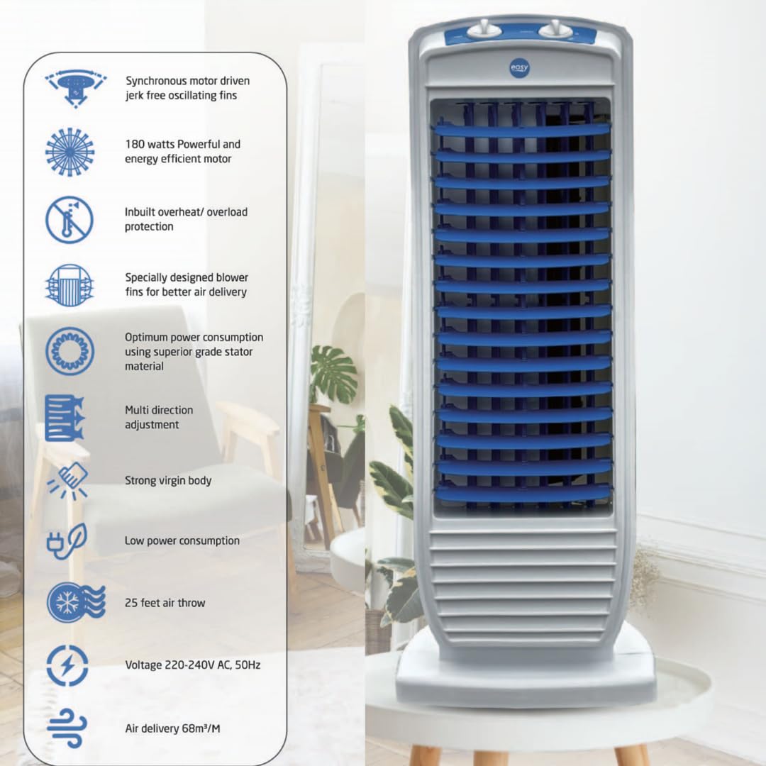 EASY High-Speed Tower Fan | 180W Powerful Motor, 25ft Air Throw, Multi-Directional Adjustment | Tower Fan for Home (White & Blue)