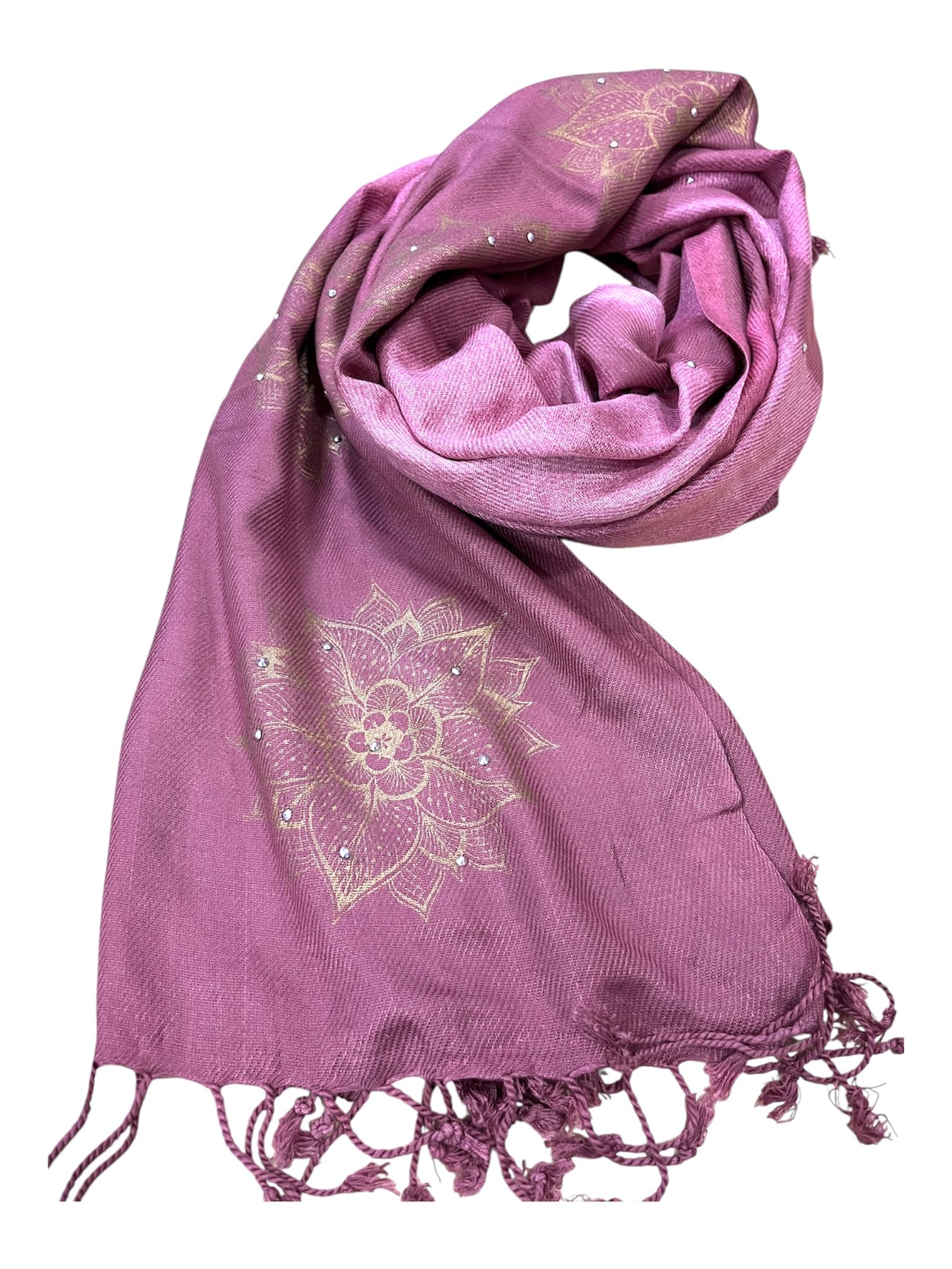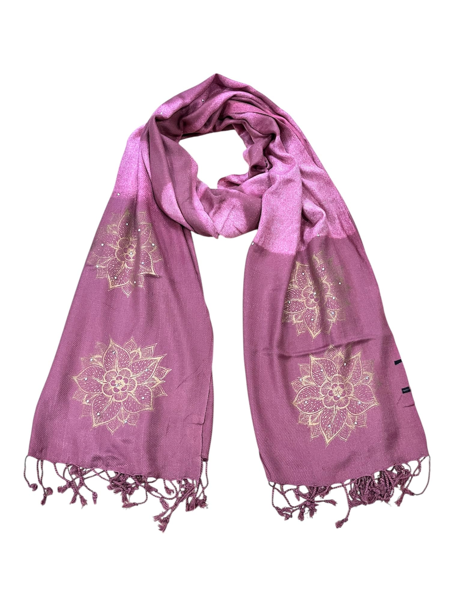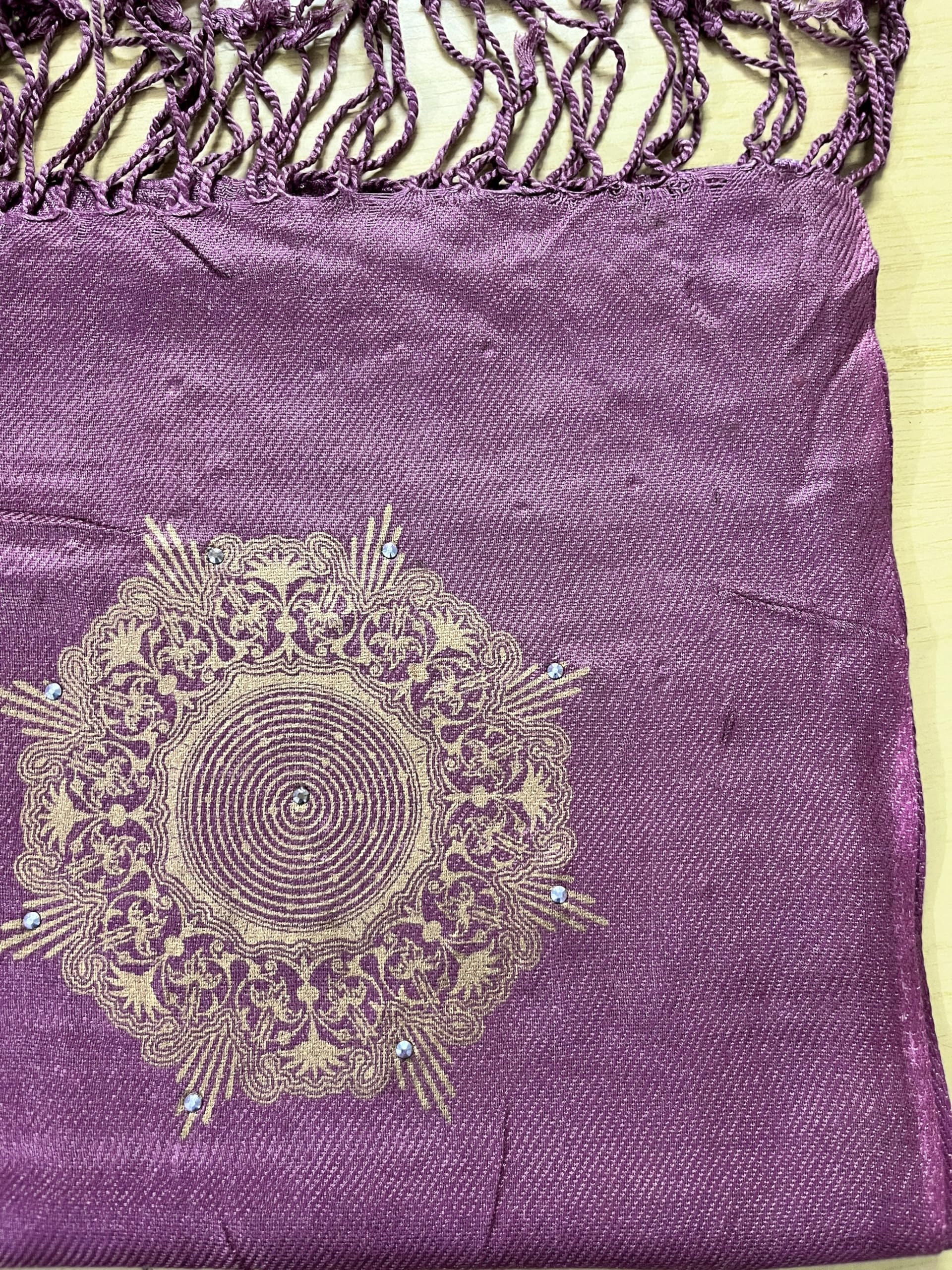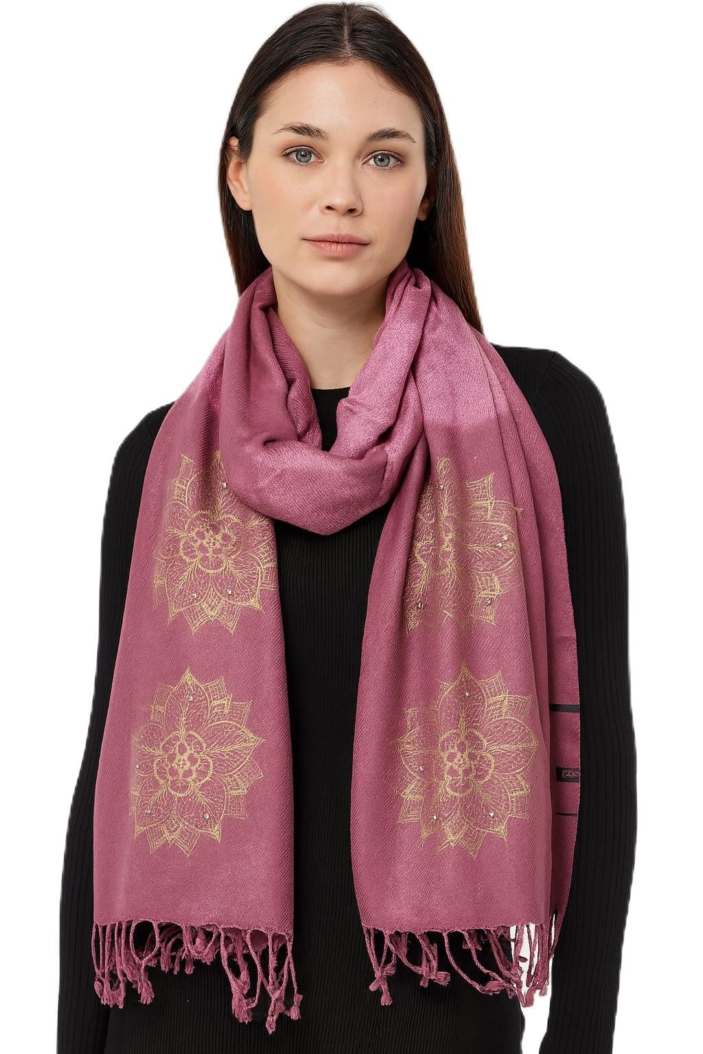 Elegant Women's Shawl with Gold Mandala Pattern, Mauve Pink Pashmina Wrap, Tasseled Scarf with Floral Embroidery