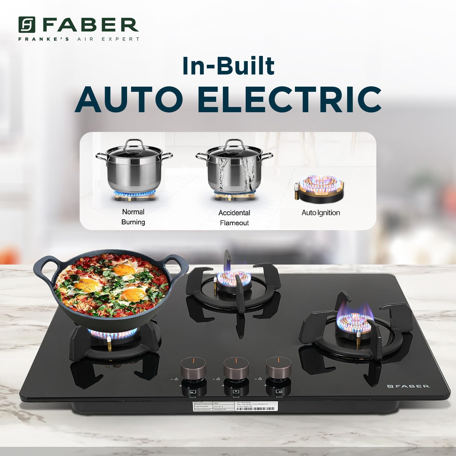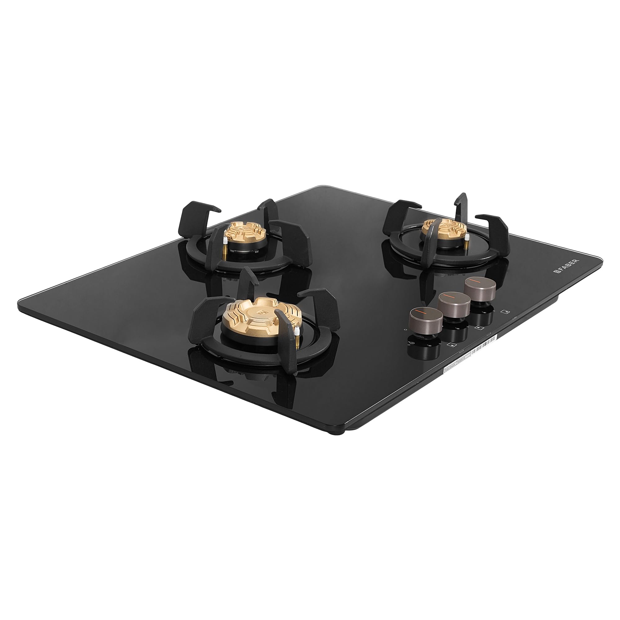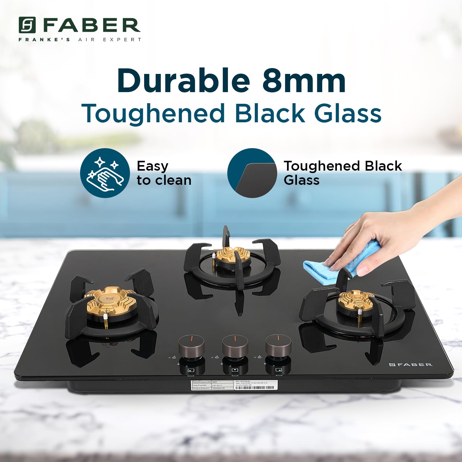 Faber 3 Burner 70cm Hob |Auto-Ignition| HOB PRIME HT703 CRS BR CI AI |Metal Knobs| Cast Iron Pan Support |Hob/Cooktop Hybrid| Black Glass Finish |5 Yr Warranty on Glass,Valve & 2 Yr on Burner by Faber