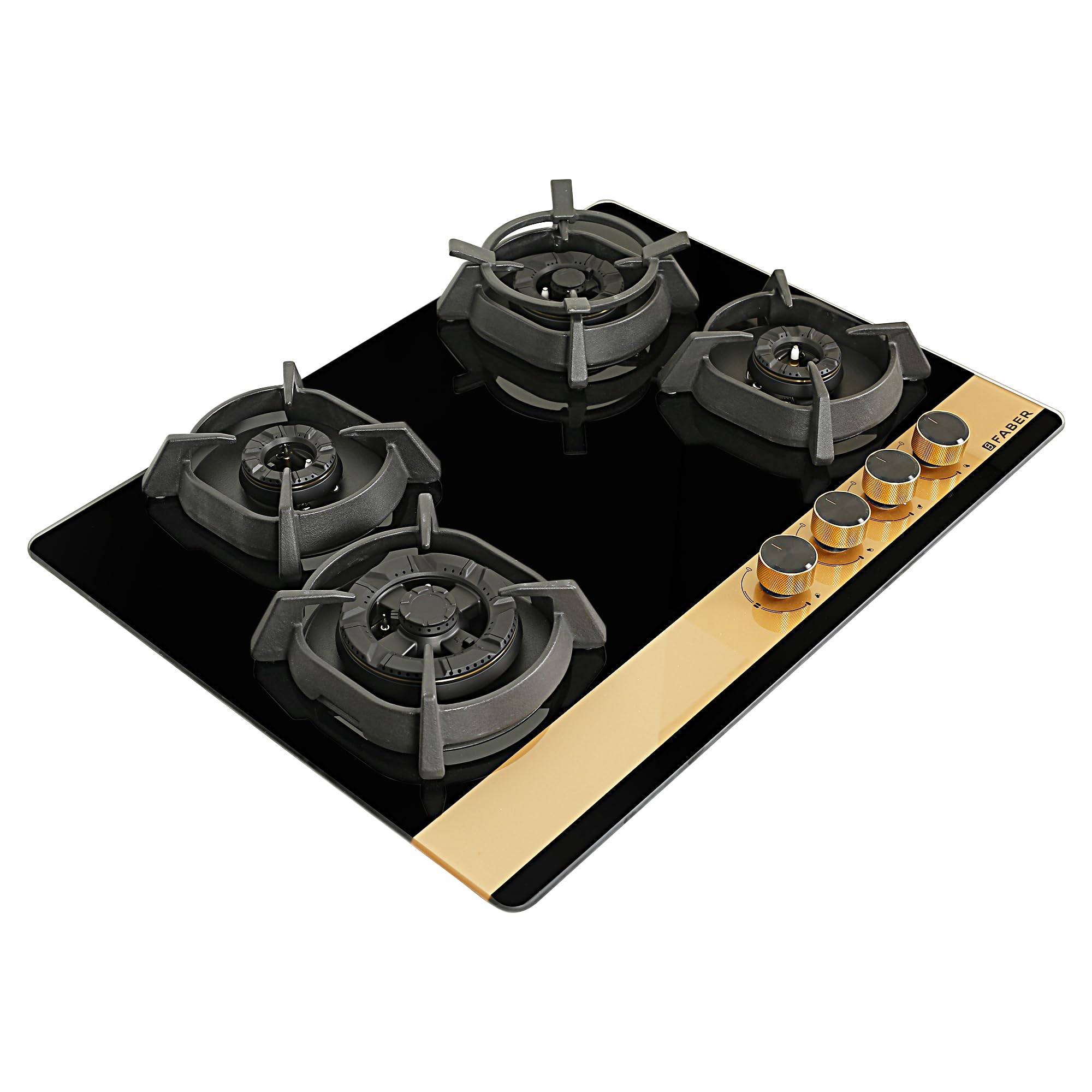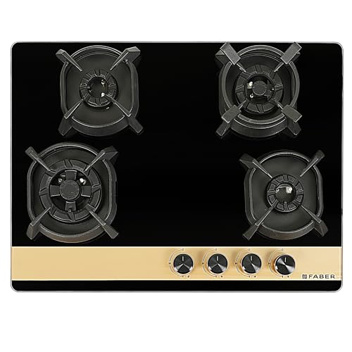 Faber 70cm 4Burner Gas Hob | Flame Failure Device | Cast Iron Pan Support | Metal Knobs | Dual Flame Burner | 8mm Toughened Black Glass | Versatile Hob/Cooktop | Hob Utopia Pro HT 704 BR CI