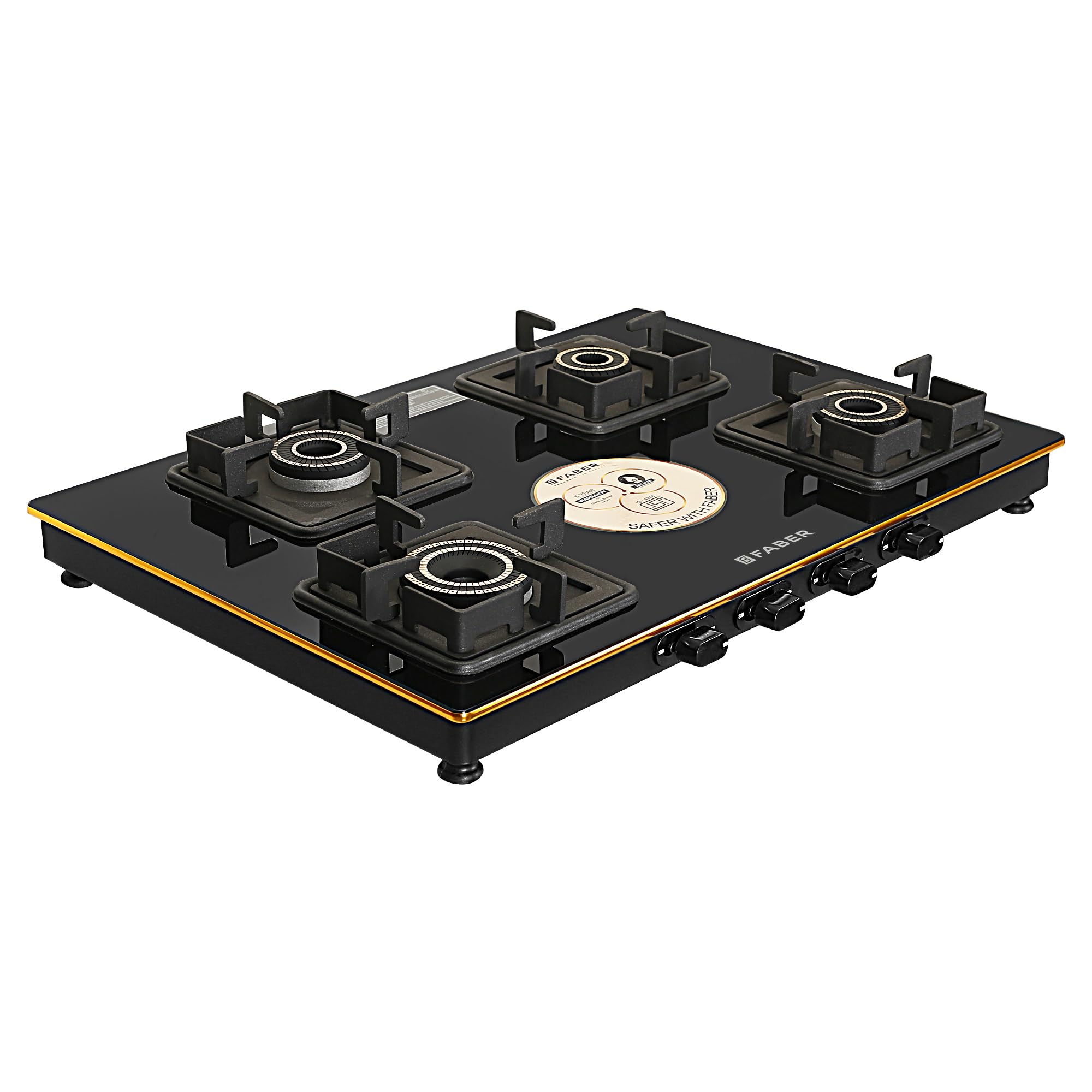 Faber Stylish 4 Brass Burners 69cm Sleek Cooktop |Manual Ignition|MS Powder Coated Pan Support|Black Glass Finish|5 Yrs Warranty Glass & Burners|2 Yrs Comprehensive & Valve| Cooktop Prince Plus 4BB BK