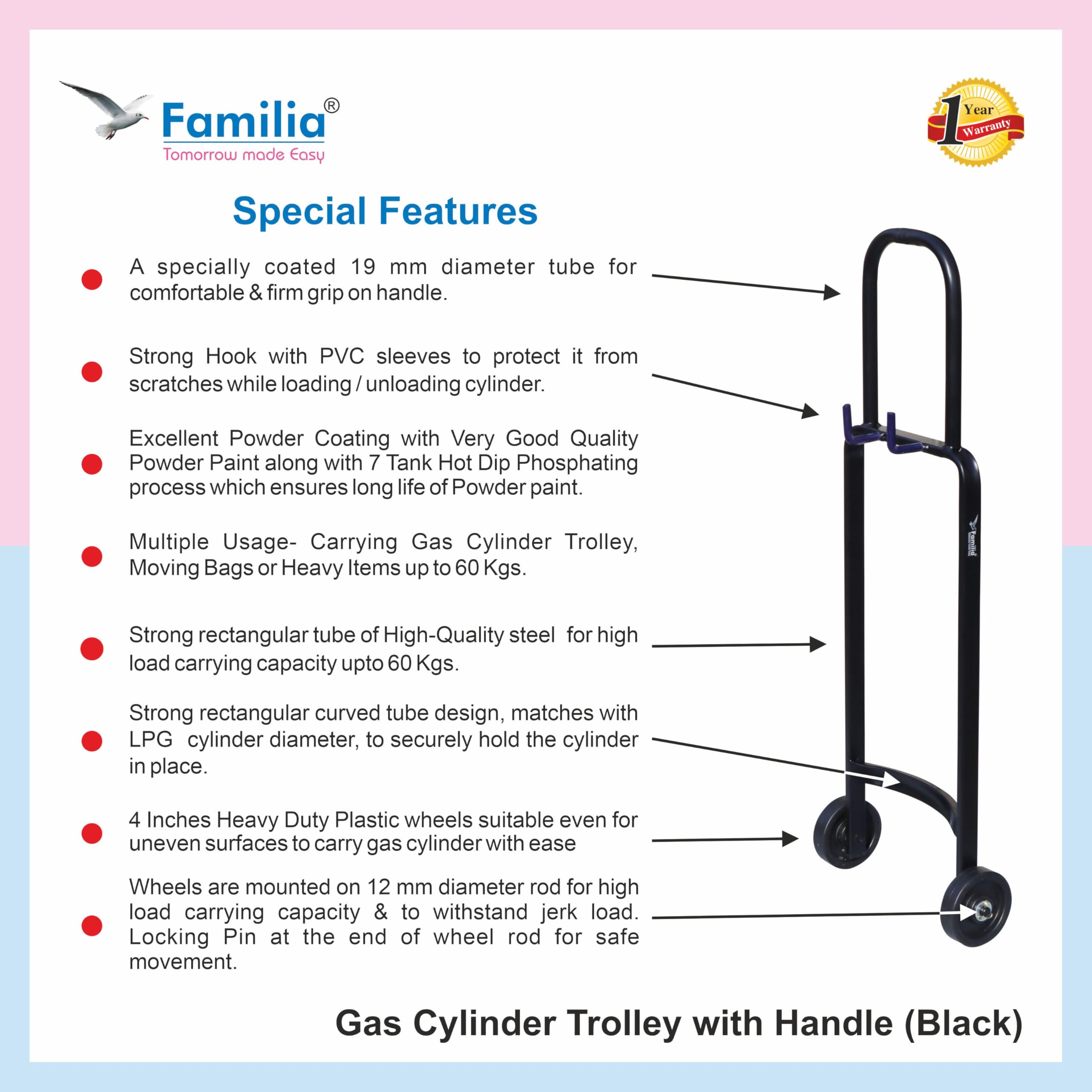 ๐ช๐ฎ๐ฟ๐ฟ๐ฎ๐ป๐๐ : Familia Gas Cylinder Trolley comes with a 1-year warranty against manufacturing defects only.