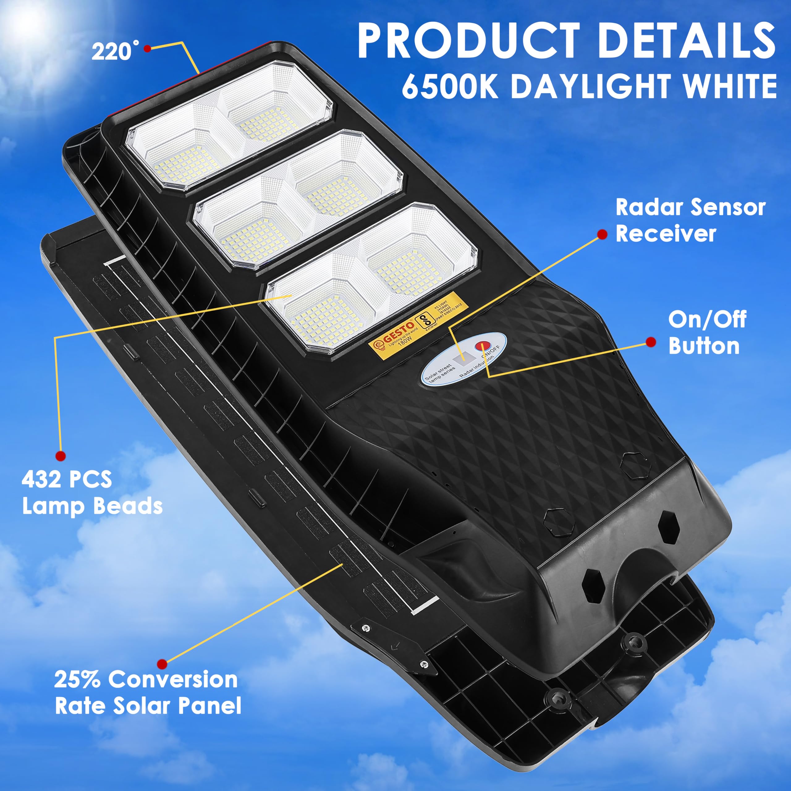 - 🌞 Super Bright 180W with 432 LEDs – Equipped with 432 high-efficiency 2835 LEDs, this 180W solar street light delivers 2800 lumens of ultra-bright lighting, ideal for illuminating streets, gardens, pathways, parking lots, and outdoor security