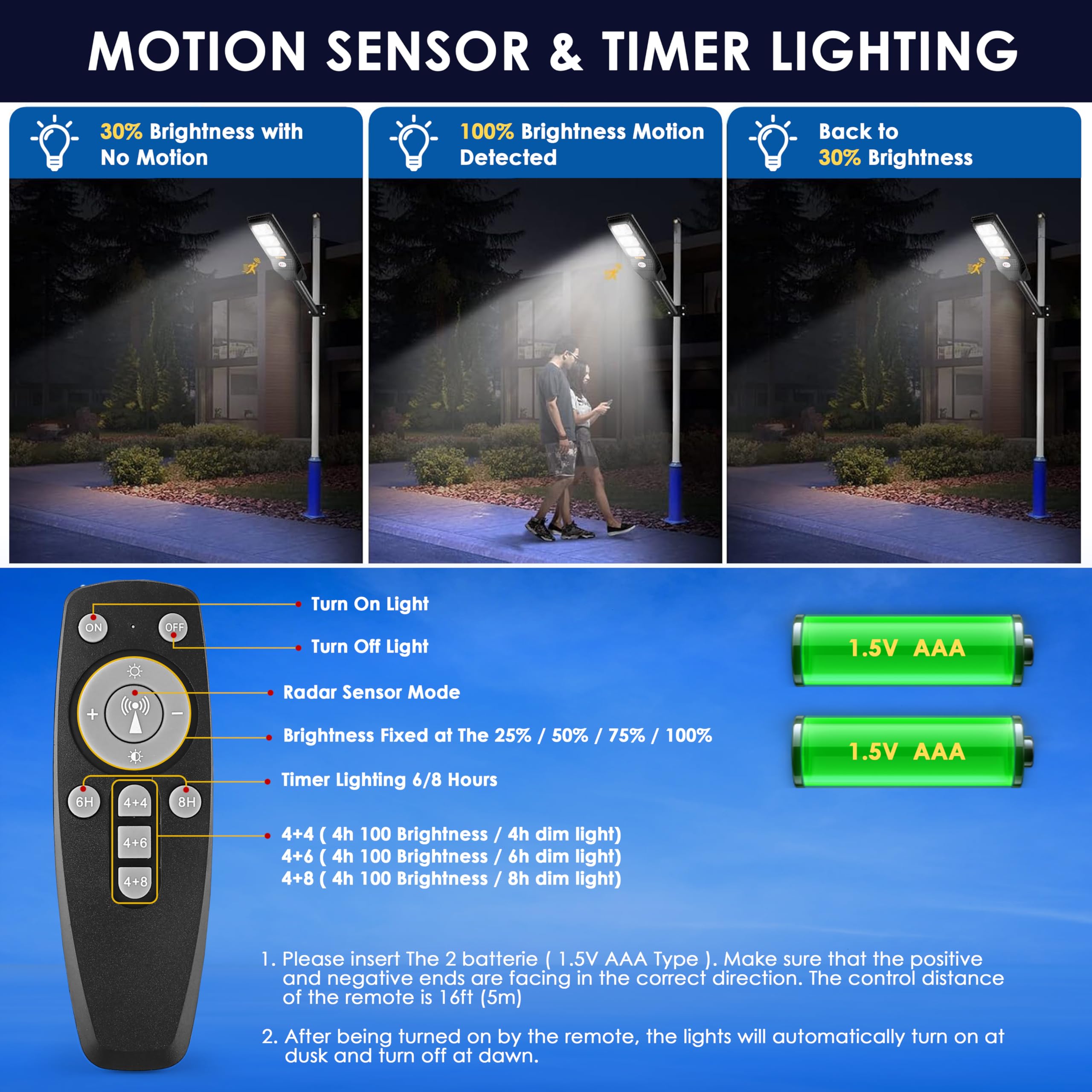 - 🎮 Remote Control & 3 Intelligent Modes – Control brightness up to 20 ft distance with the remote. Features 3 modes: Motion Sensor (30%–100%), Timer Mode (6H/8H), and Always-On. Also includes 10-level dimmable settings and energy-saving scheduling.