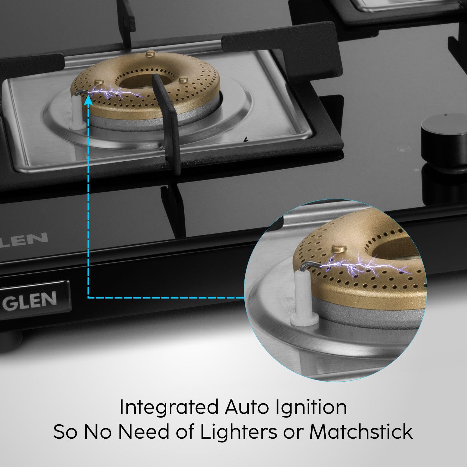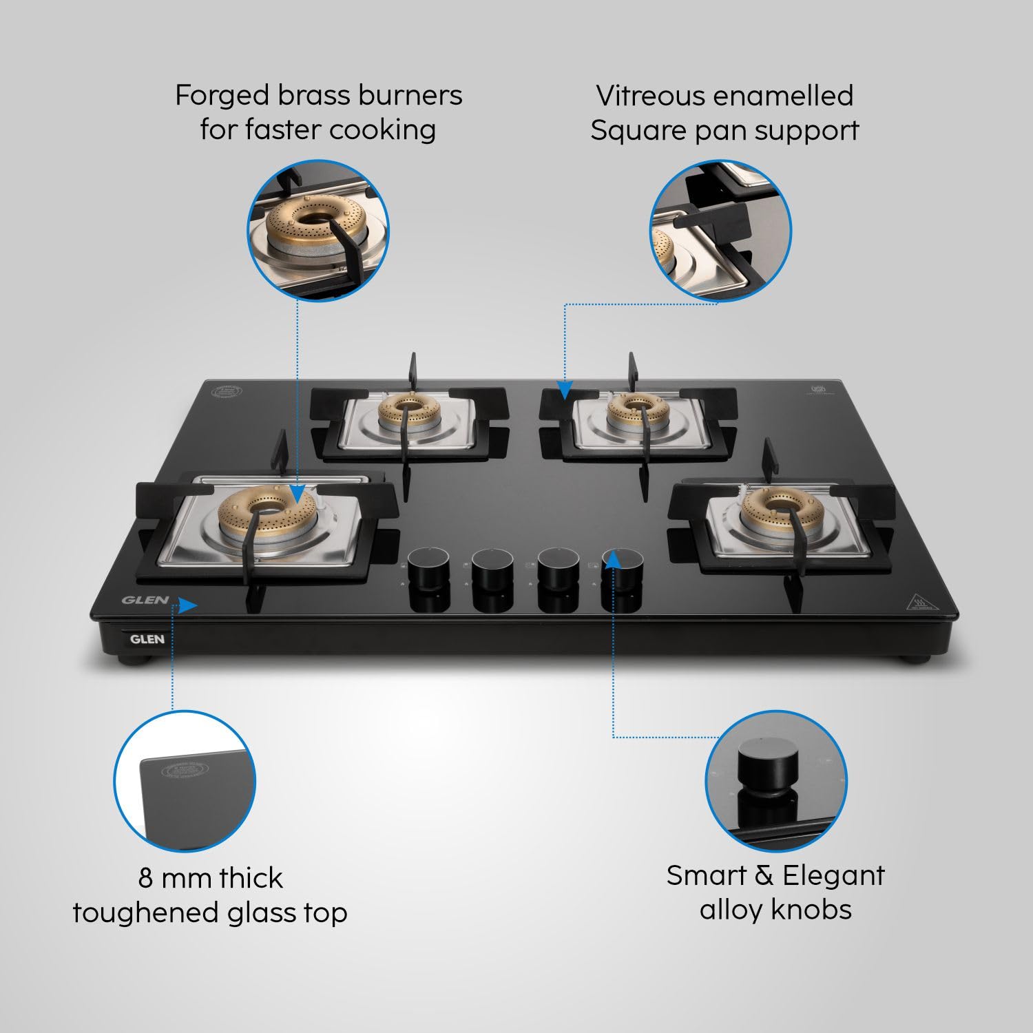 Glen 4 Burner Ultra Slim Free Standing Hob | 8 MM Toughened Glass Top | Black | Forged Brass Burners | Warranty 2 Years Standard | BH1074USBL75