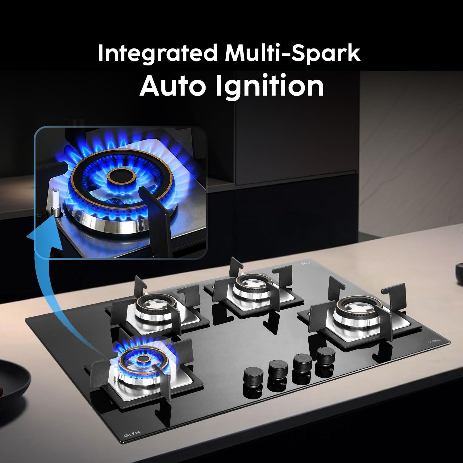 Glen Built-in Hob 4 Burner Gas Stove | Black Toughened Glass Top | Auto Ignition | Forged Brass Burners | Mini Triple Ring & Double Ring | 2-Year Warranty