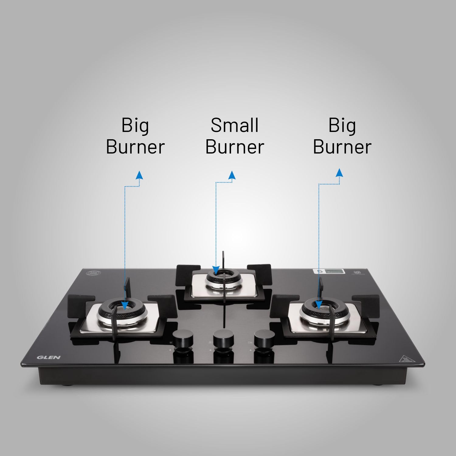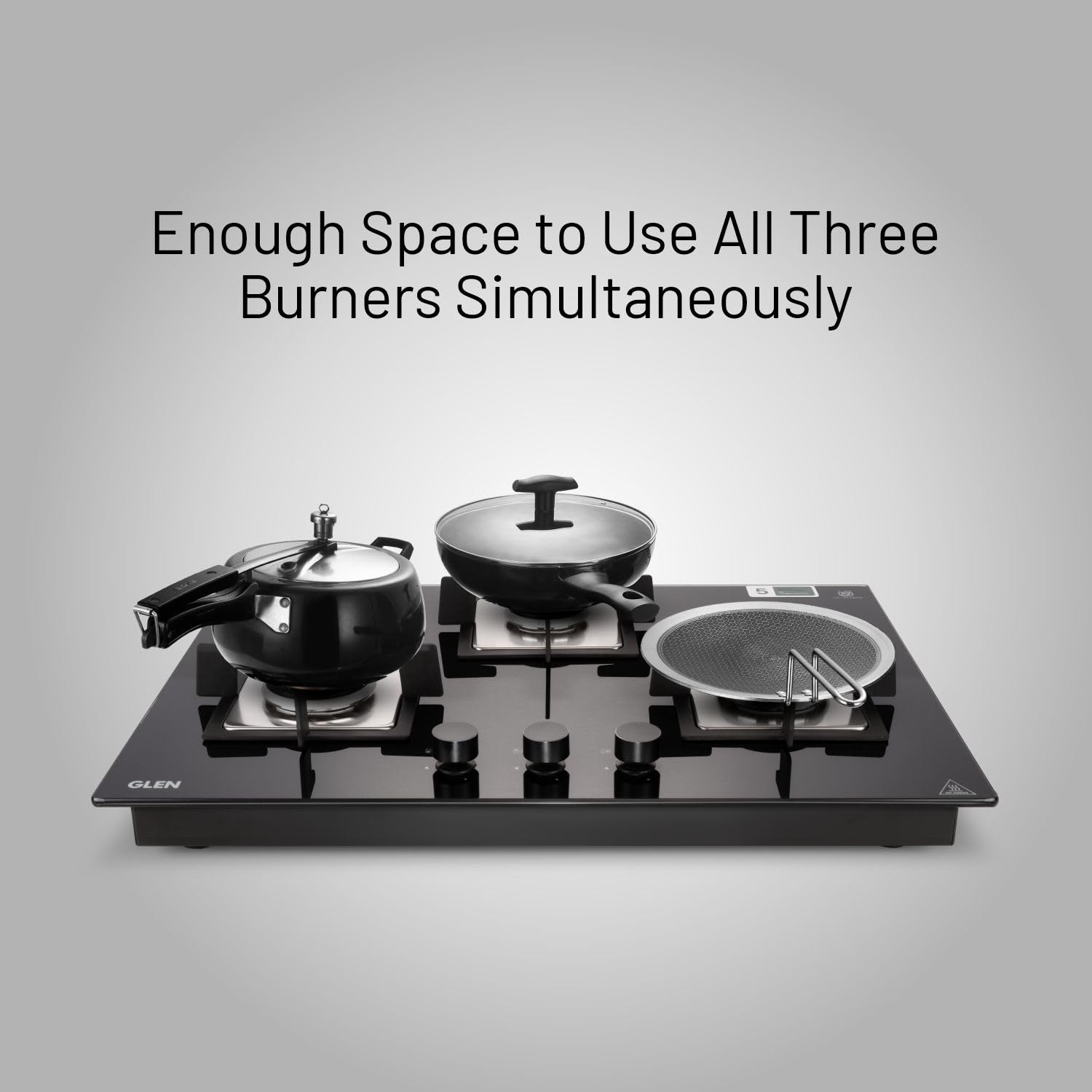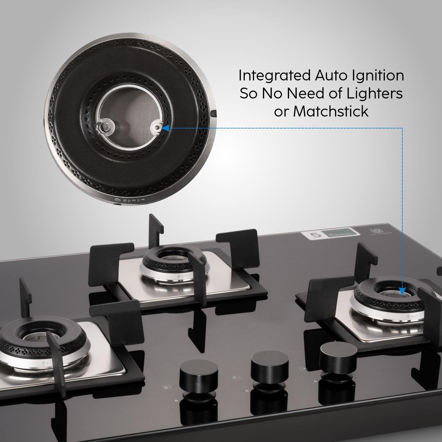 Glen Hob Top 3 Burner Built In Hob In Glass Hob Gas Stove 3 Burner Auto Ignition | 8 MM Toughened Glass | Italian Burner with Double Ring Flame Warranty 2 Years Standard (1073 SQ HT IN 70)