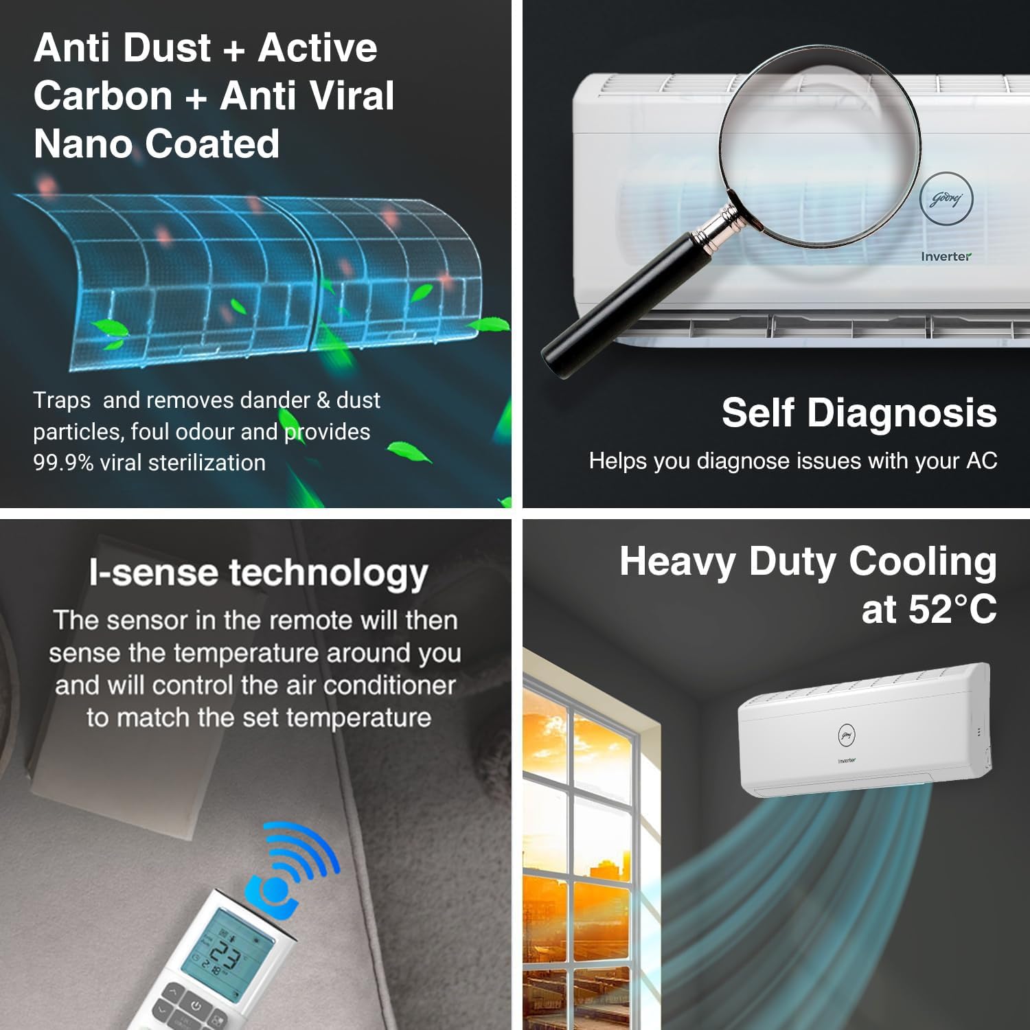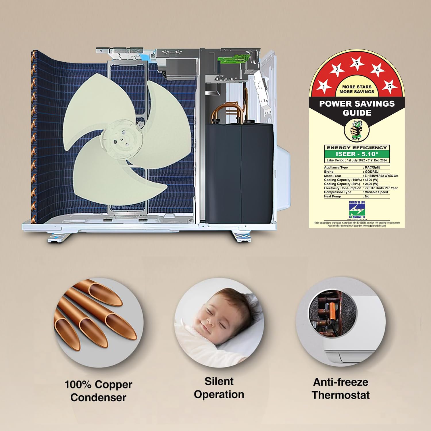 Godrej 1.5 Ton 5 Star, 5 Years Comprehensive Warranty, 5-In-1 Convertible Cooling, Inverter Split AC (Copper, Heavy Duty Cooling at 52°C, 2024 Model, AC 1.5T EI 18IINV5R32 WYS, White)