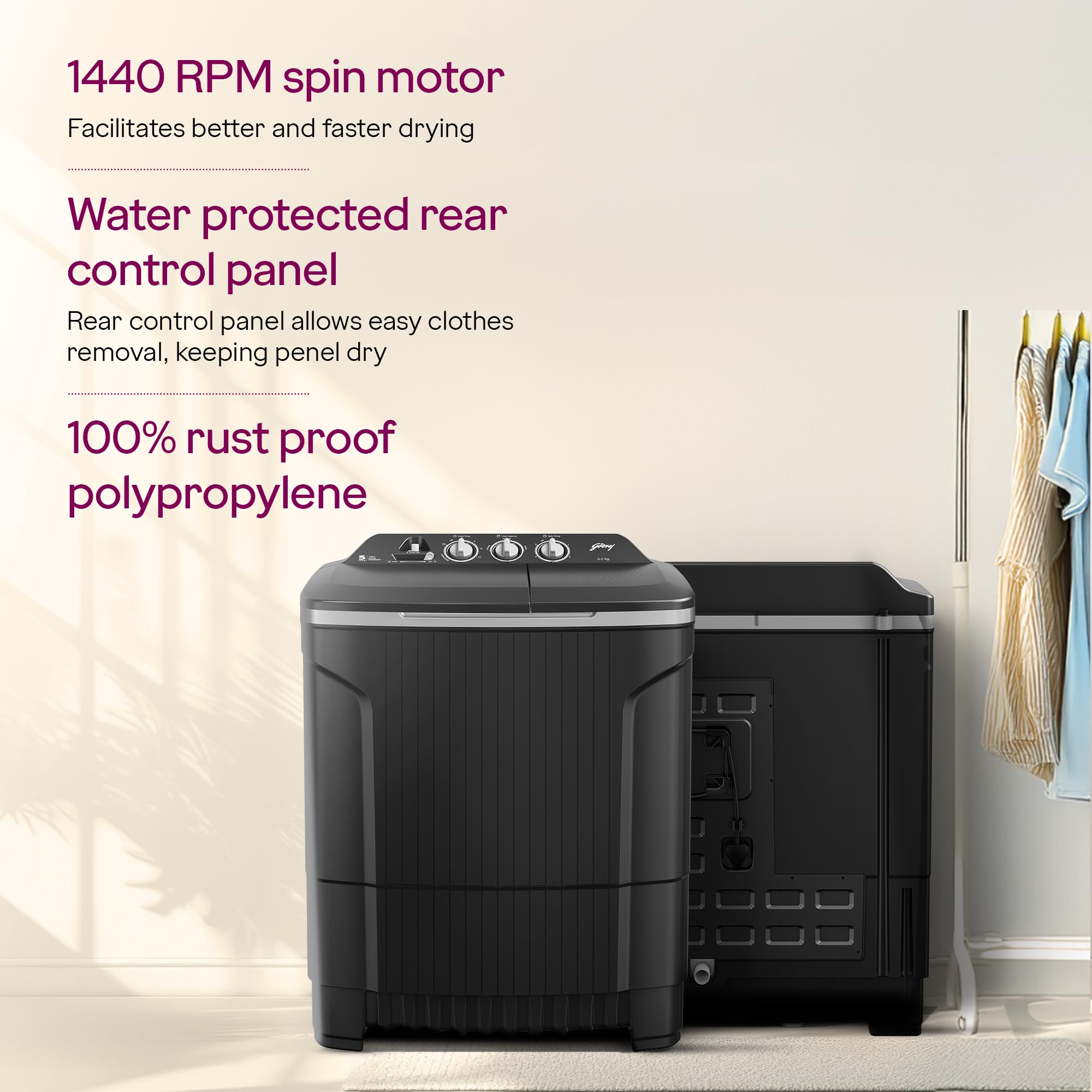 Brand: GodrejColor: Crystal greyFeatures: Semi-automatic washing Machine: Economical, Low water and energy consumption, involves manual effort; Has both washing and... Read more