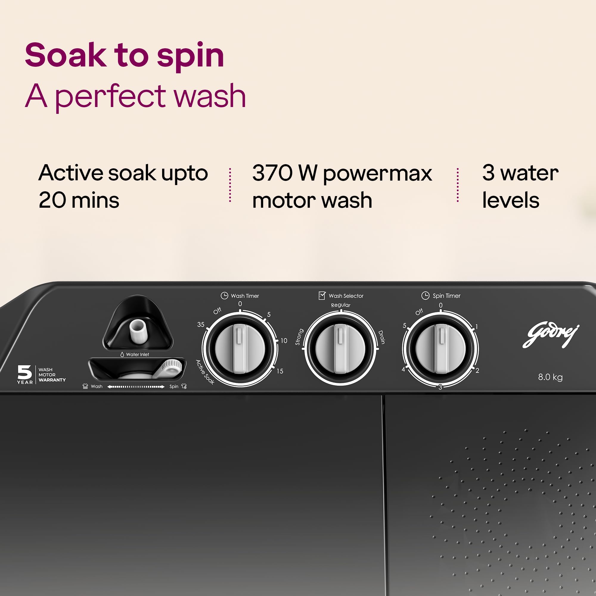 Godrej 8 Kg 5 Star, Wash Upto 8 King Size Bedsheets, 370 W PowerMax Motor, 1440 RPM Spin, Magic Lint Fliter, Semi Automatic Top Load Washing Machine (WSEDGE CLS 80 5.0 EN2 M CSGR, Crystal Grey)