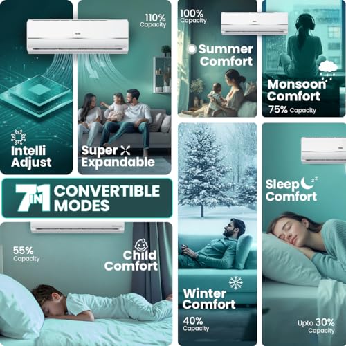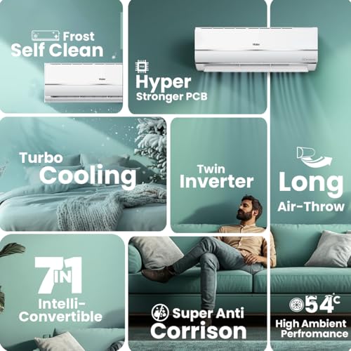 Haier 1 Ton 3 Star Twin Inverter Split AC (Copper, 7 in 1 Convertible, Frost Self Clean, HD Filter, Cools at 54°C, Long Air Throw - HSU11V-TMS3BN-INV,White)