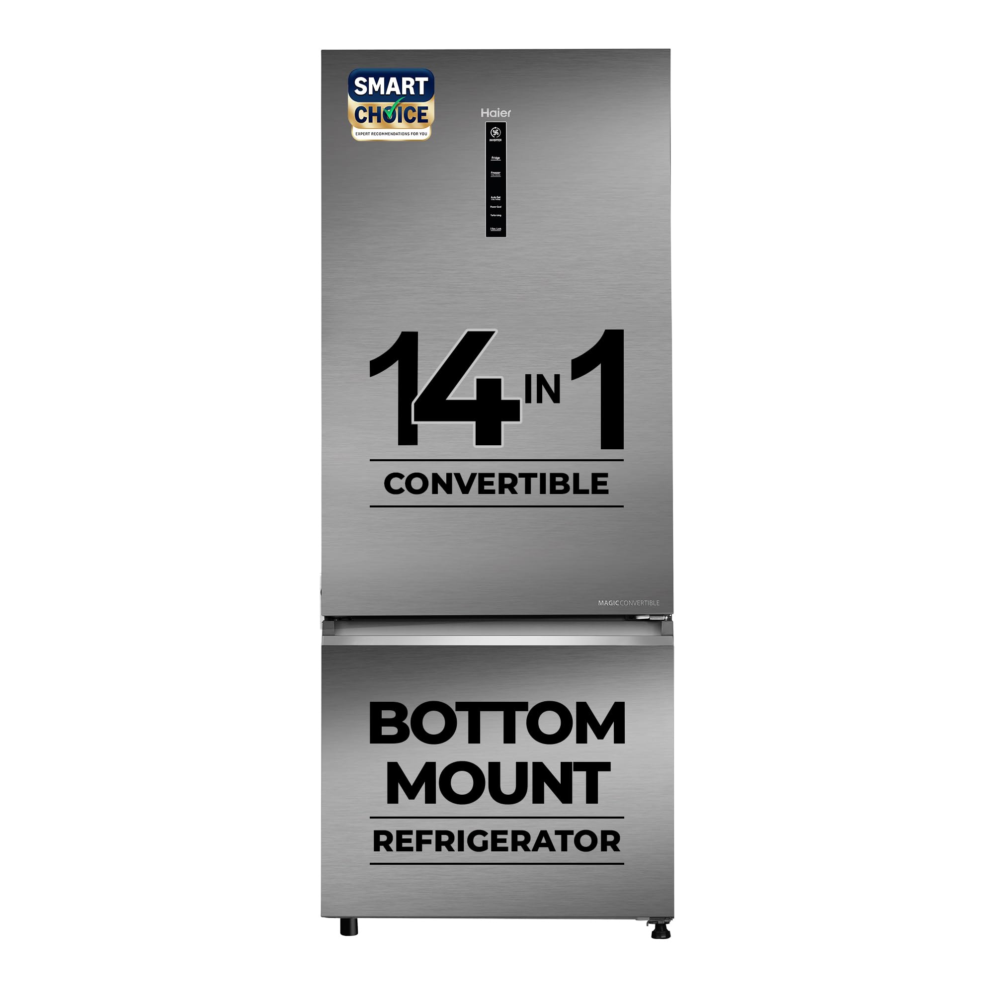 Haier SmartChoice 445 L 2 Star Frost Free Bottom Mount Double Door Refrigerator | Convertible 14-in-1 | Jhukna Mat-Bottom Freezer | Digital Display Panel | Triple Inverter (HEB-452TS-P, Inox Steel)