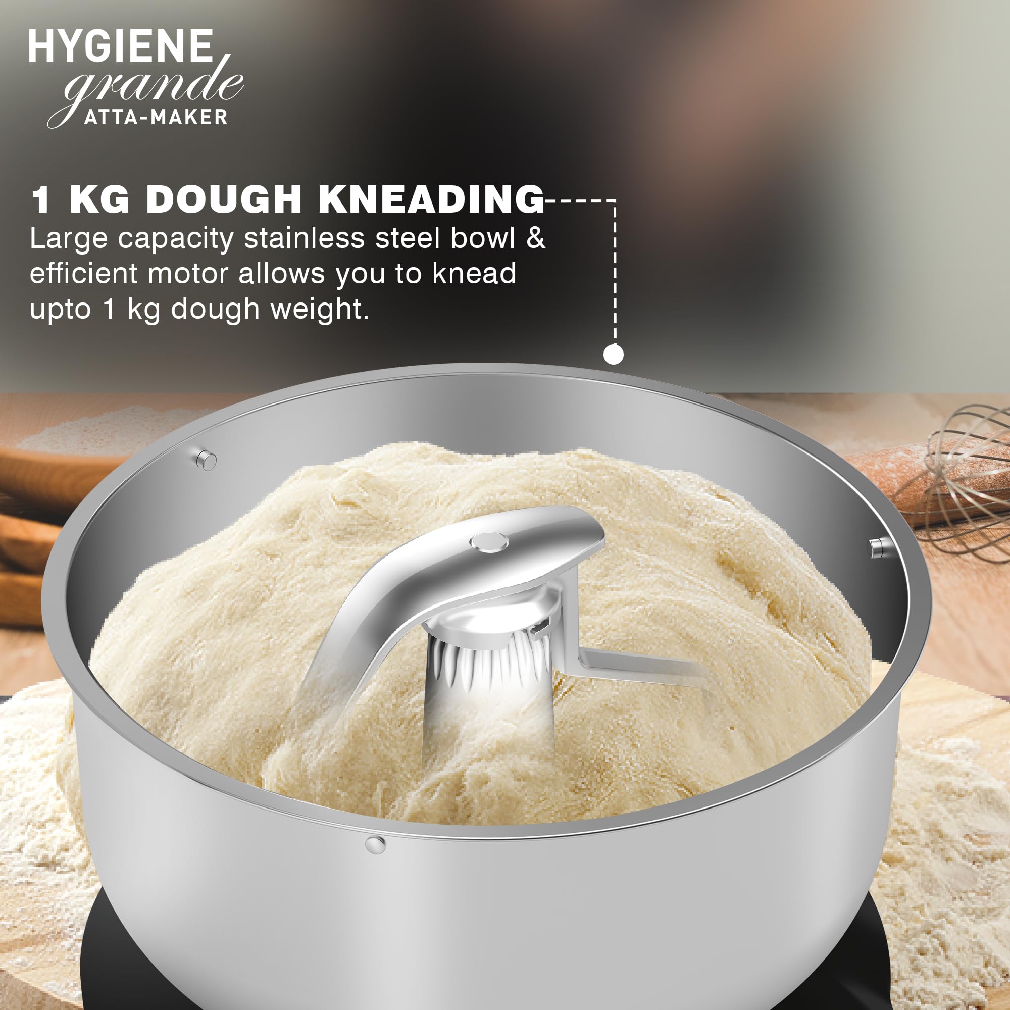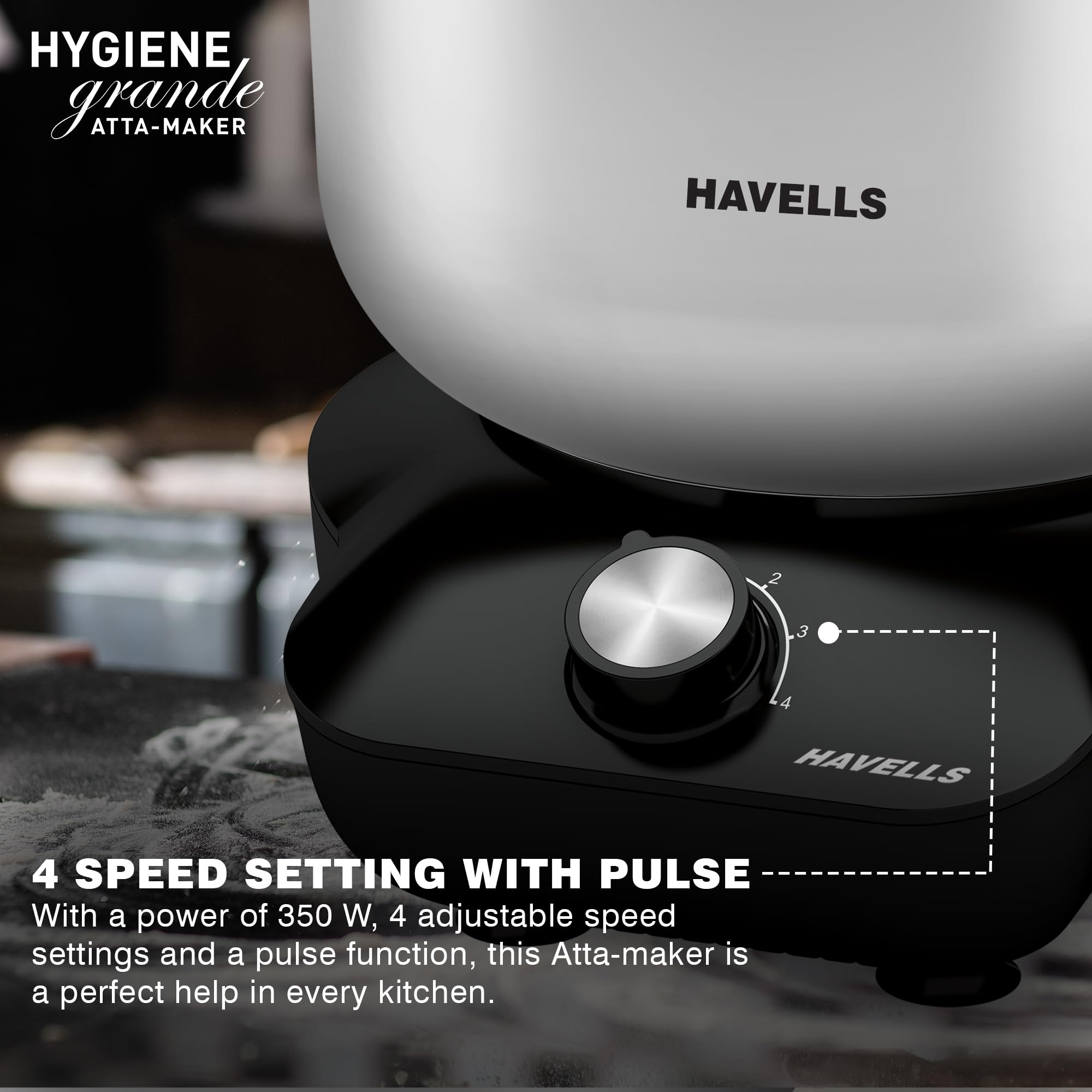 Havells Hygiene Grande Atta Kneader Dough Maker with 5L SS Bowl, Up to 1 KG Dough Maker, 4 Speed, Aluminium Dough Hook, Transparent Anti Splatter Lid with Lock, Hands Free Operation, 2 Yr Warranty