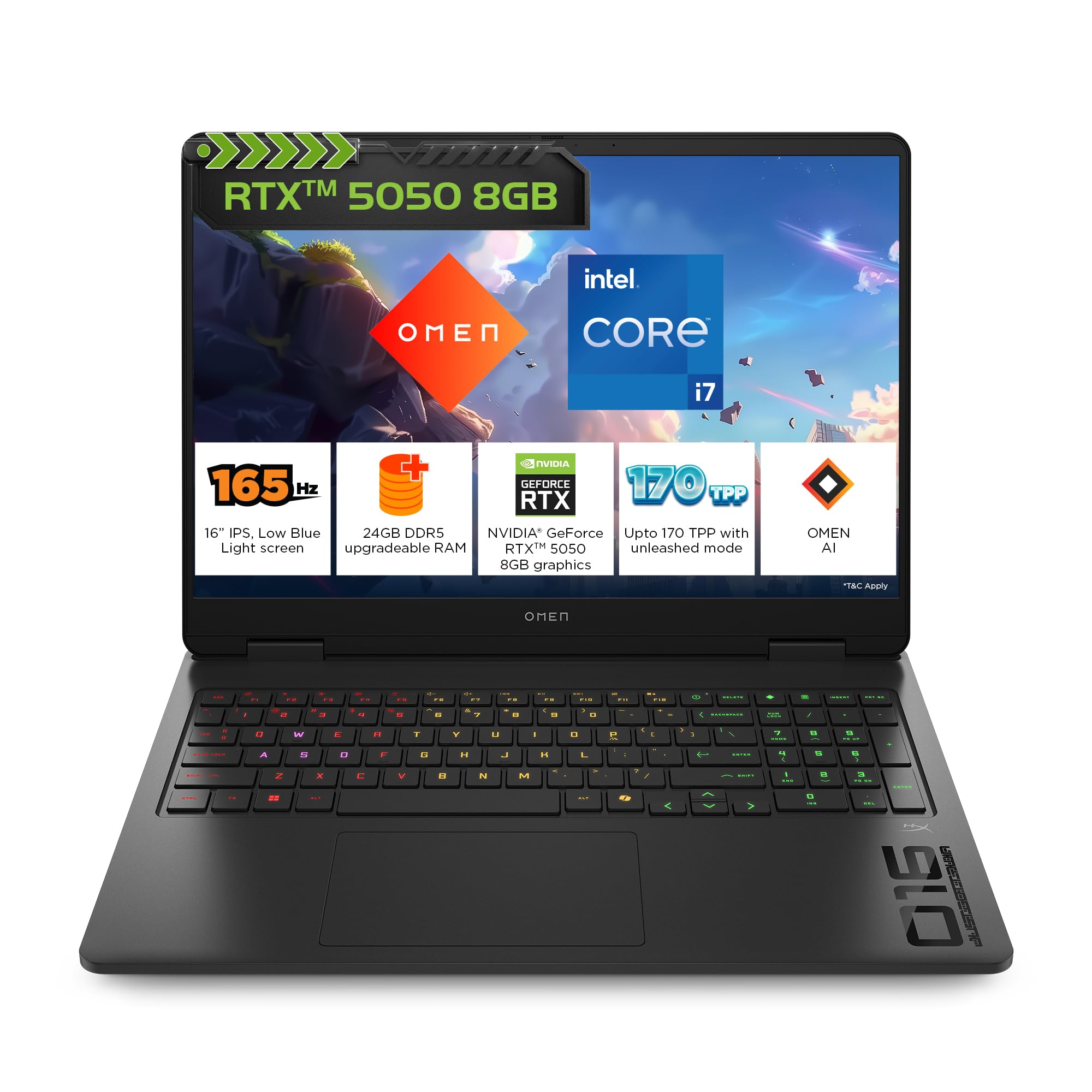 HP Omen, 14th Gen Intel Core i7-14650HX, 8GB RTX 5050, 24GB DDR5(Upgradeable) 1TB SSD, 165Hz, 2k WUXGA, 3ms, 400 nits, 16''/40.6cm, Win11, M365* Office24, Black, 2.43kg, am0241TX, RGB Gaming Laptop