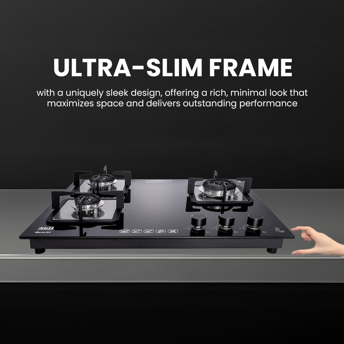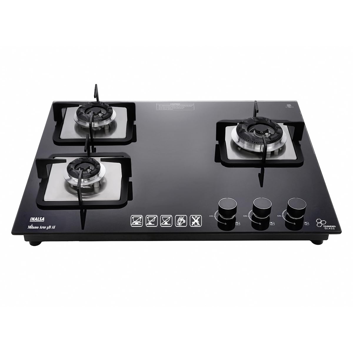 INASLA Premium 3 Burner ≈70cm Gas Stove|5Yr Warranty on Glass & 2Yr on Burner|8MM Toughened Glass|Auto Ignition|Jumbo Brass Burner|LPG Ready &PNG Compatible|360° Gas Nozzle|Milano Arte3B