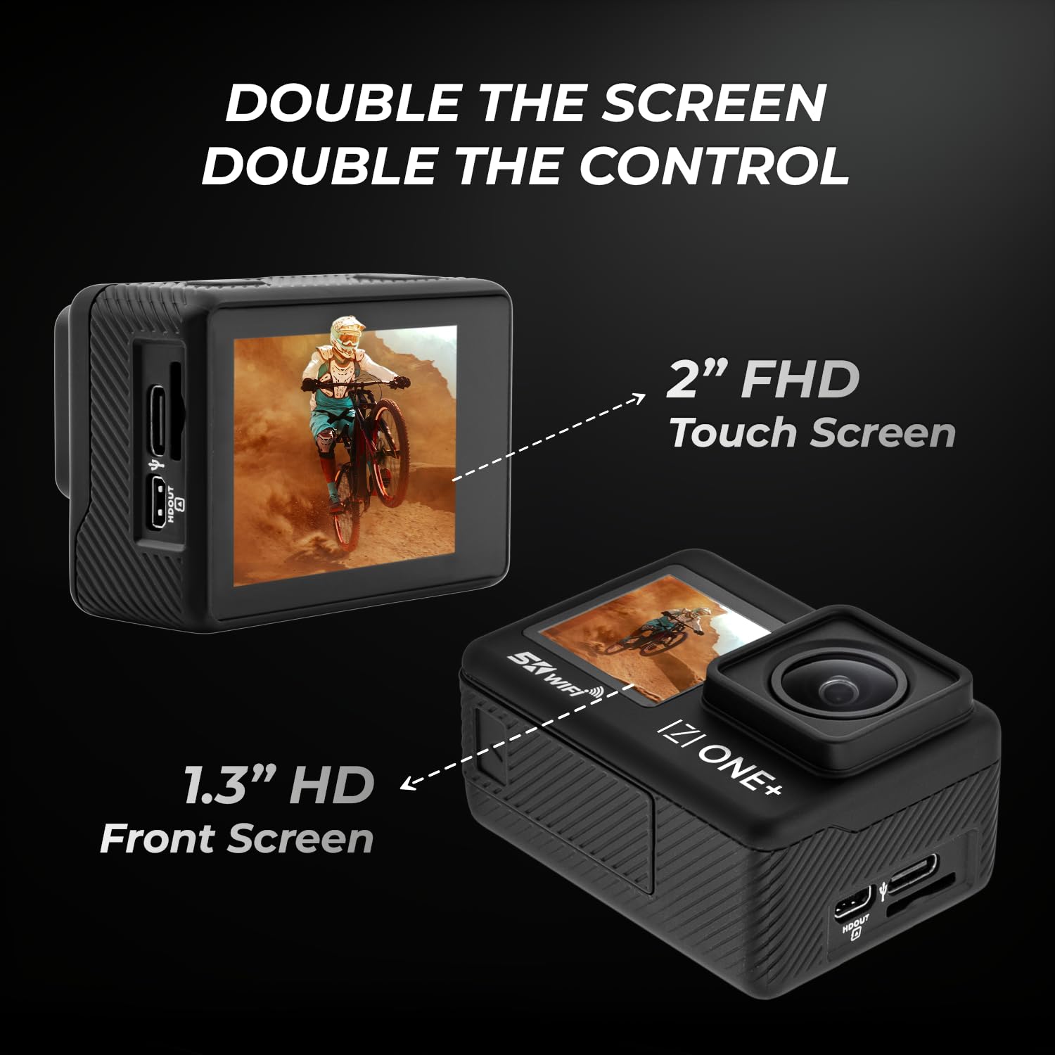 IZI ONE Plus 5K 48MP Action Camera - 6-Axis Gyro Stabilization, 110ft Waterproof, Vlogging, 170° FOV, WiFi, Dual Touch Screen Video Camera, 2X 1350mAh Batteries, Fast C-Type Charge HQ External Mic.