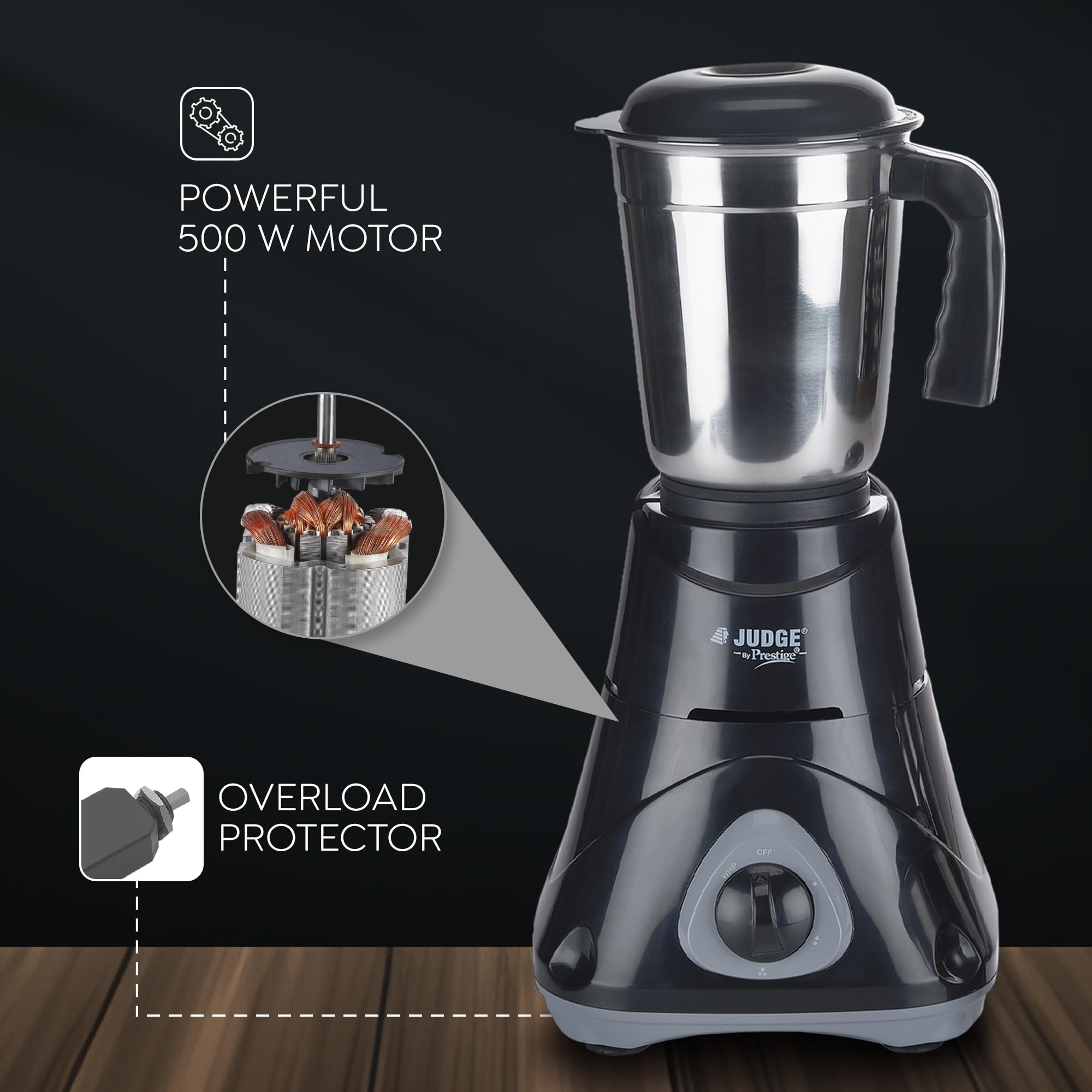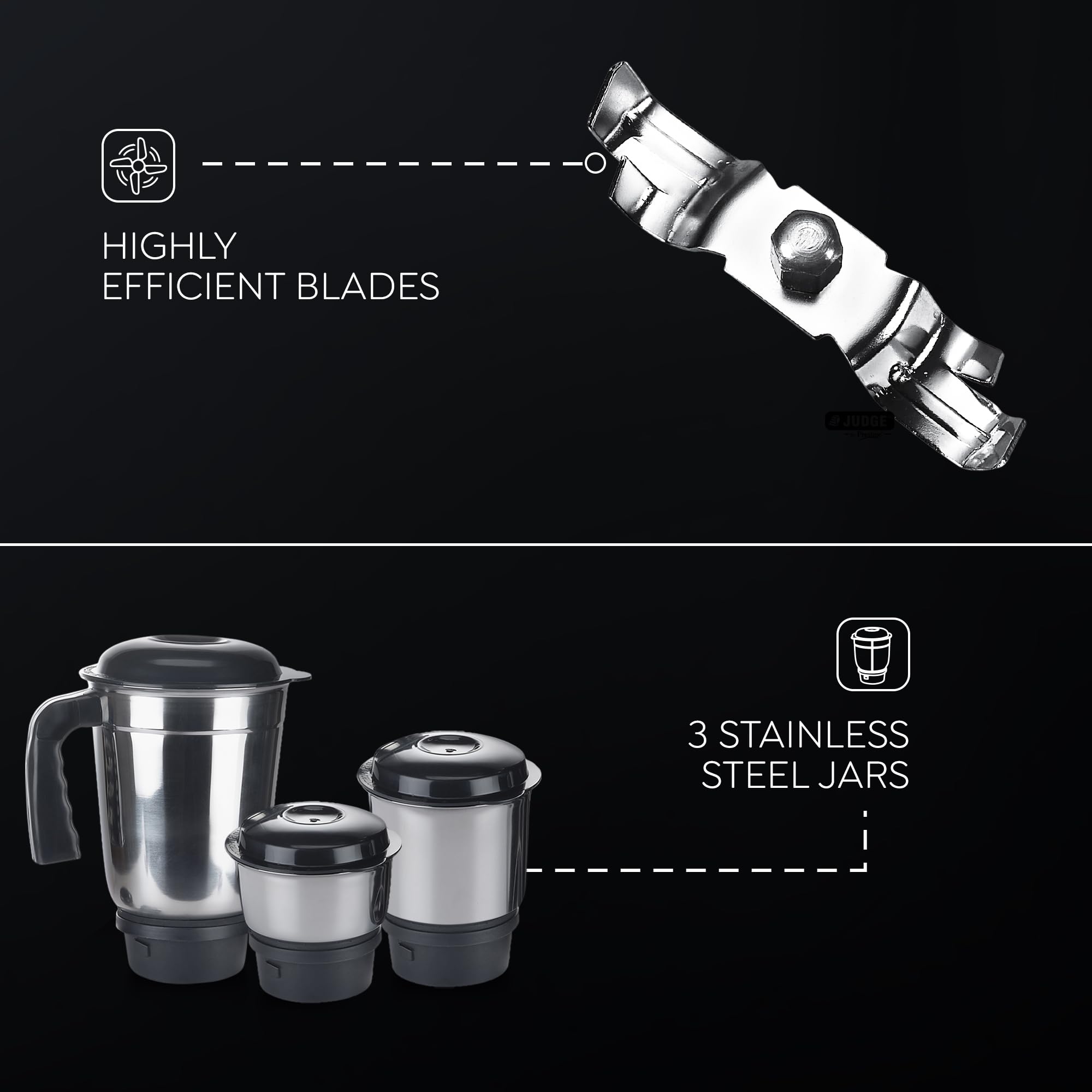 Judge by Prestige 500 Watts ACE Mixer Grinder with 3 Stainless Steel Jars| 3 Efficient Stainless Steel blades| Overload Protector| Sturdy Handles| Black