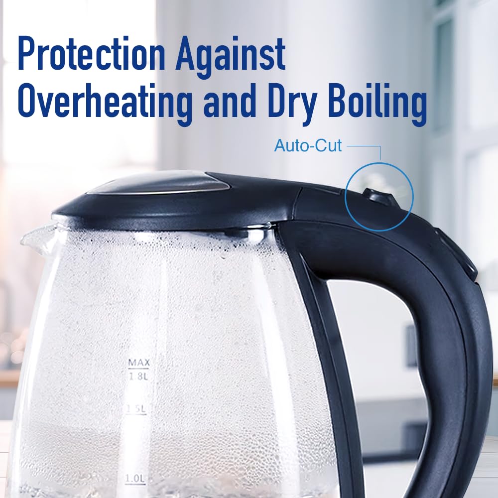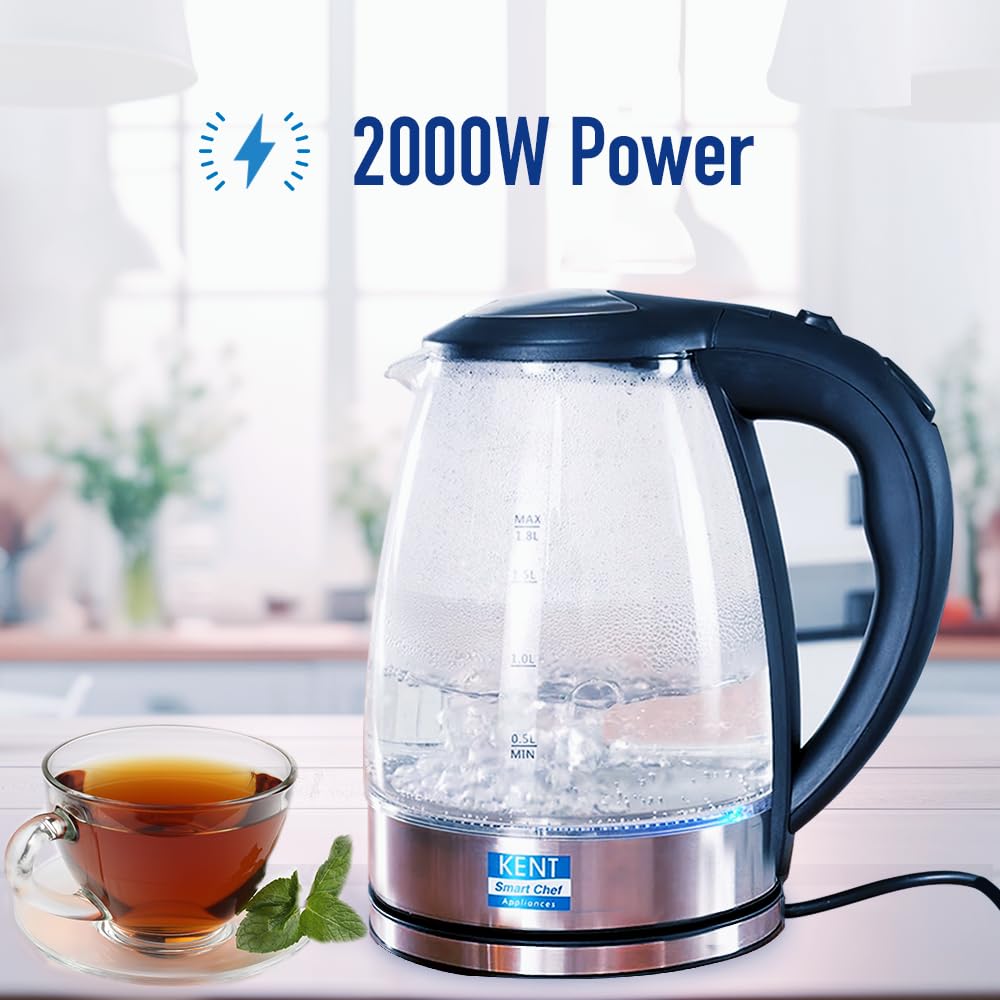 KENT Elegant Electric Glass Kettle (16052), 1.8L, Stainless Steel Heating Plate, Borosilicate Glass Body, Boil Drying Protection