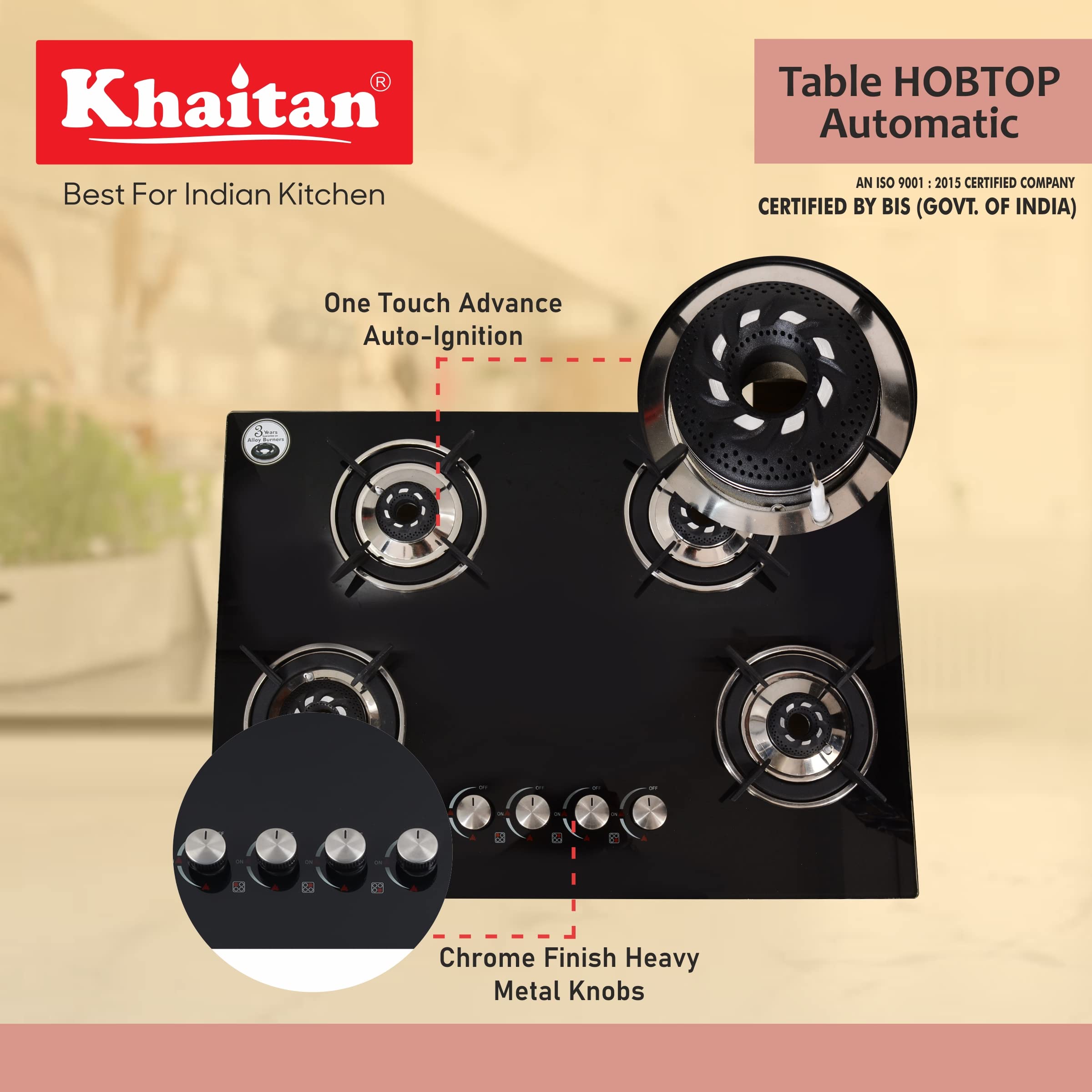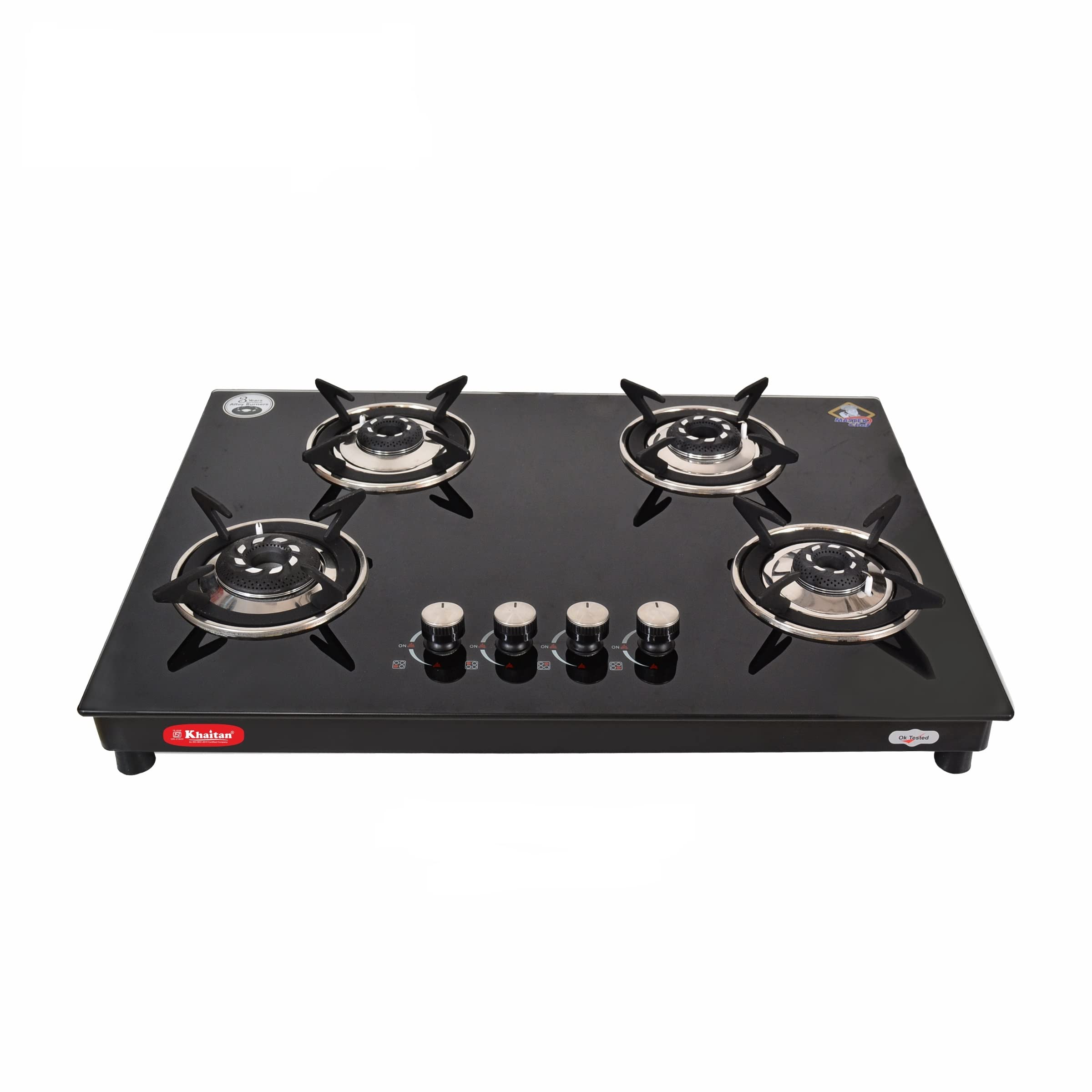 Khaitan 4 Burner Phantom Black Hobtop, Automatic Ignition Toughened Glass Top Open Cooktop Gas Stove With 1 Year Warranty