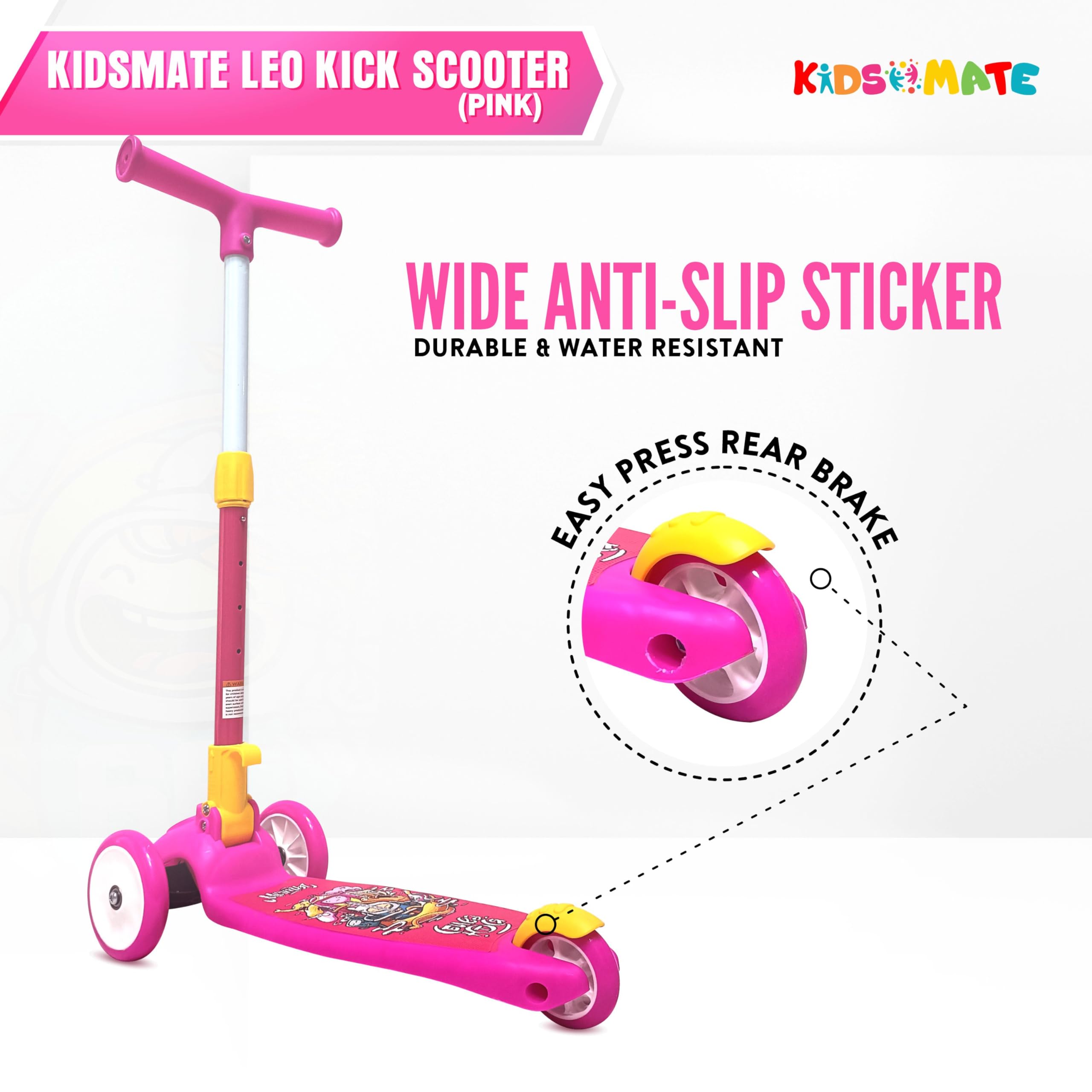 Kidsmate Leo Kick Scooter for Kids, 4 Adjustable Height Scooter, Foldable & Attractive PVC Wheels with Rare Brakes for Kids Age Upto 3+ Years (Pink)