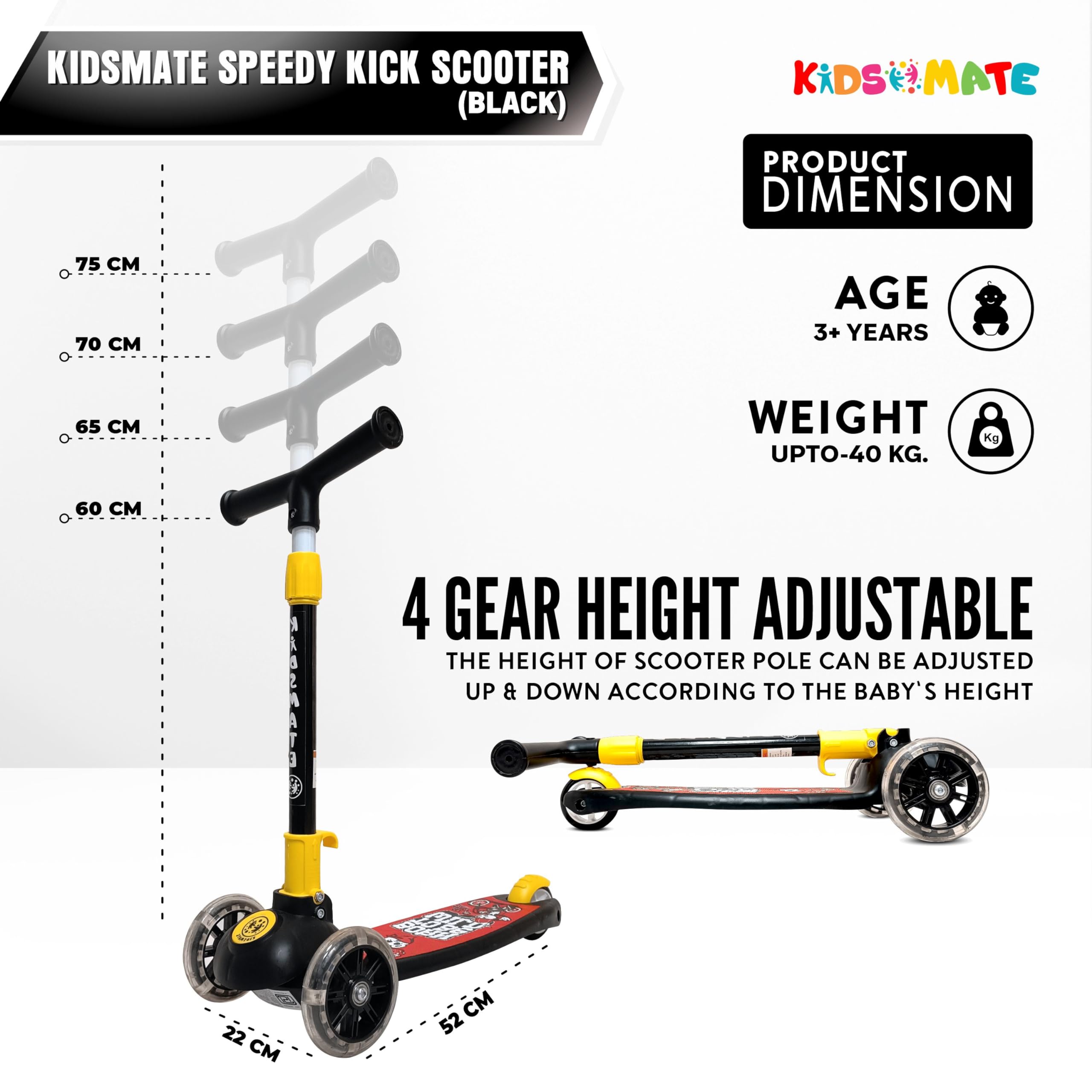Kidsmate Speedy Kick Scooter for Kids (ISI Certified) with LED Wheel Lights, Height Adjustable Handlebar & Foldable Design & Rear Brakes for Kids of Age 3+ Years (Black)