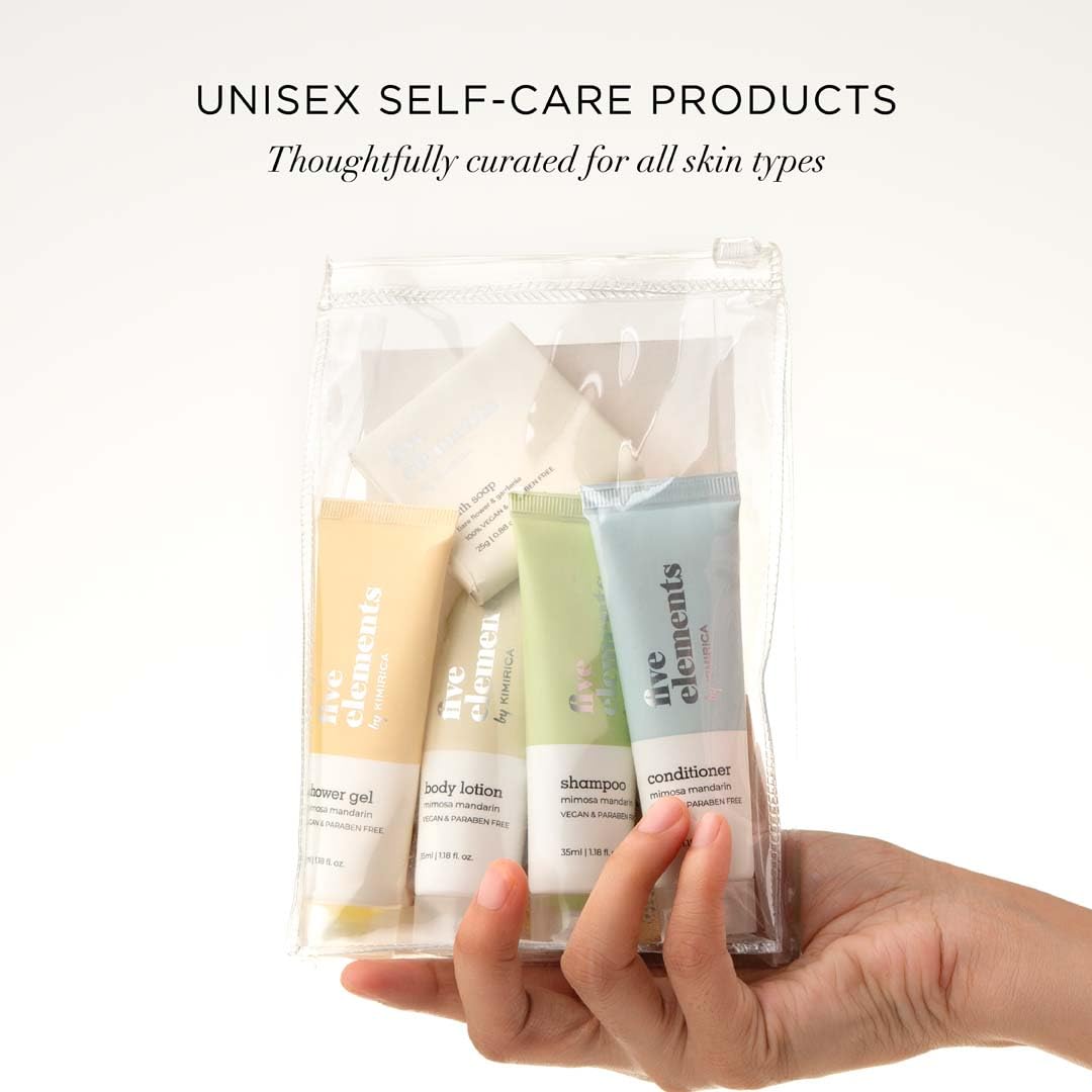 Kimirica Travel Kit Bath set Five Elements Luxury Bath and Body Care Travel pouch| 6 in 1 self-care travel kit with a reusable pouch 100% Vegan
