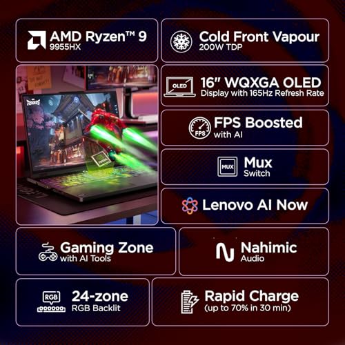 The 16" WQXGA OLED panel delivers 2560x1600, 165Hz, 1100 nits peak, 100% DCI-P3, and Dolby Vision. G-SYNC keeps frames smooth; Low Blue Light and FlickerFree reduce eye strain during long sessions. The Lenovo AI Engine+ tunes the CPU/GPU in real time for higher FPS and smarter energy use.