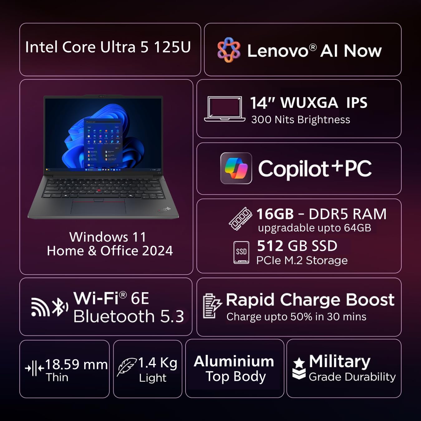 Lenovo ThinkPad E14 AI PC Intel Core Ultra 5 125U | Copilot Key | 16GB RAM | 512GB SSD | 14” WUXGA IPS 300 Nits | Win 11 + Office 2024 | Backlit | Fingerprint | 1.42 kg | 1Y Onsite | Black –21M7S0SJ00