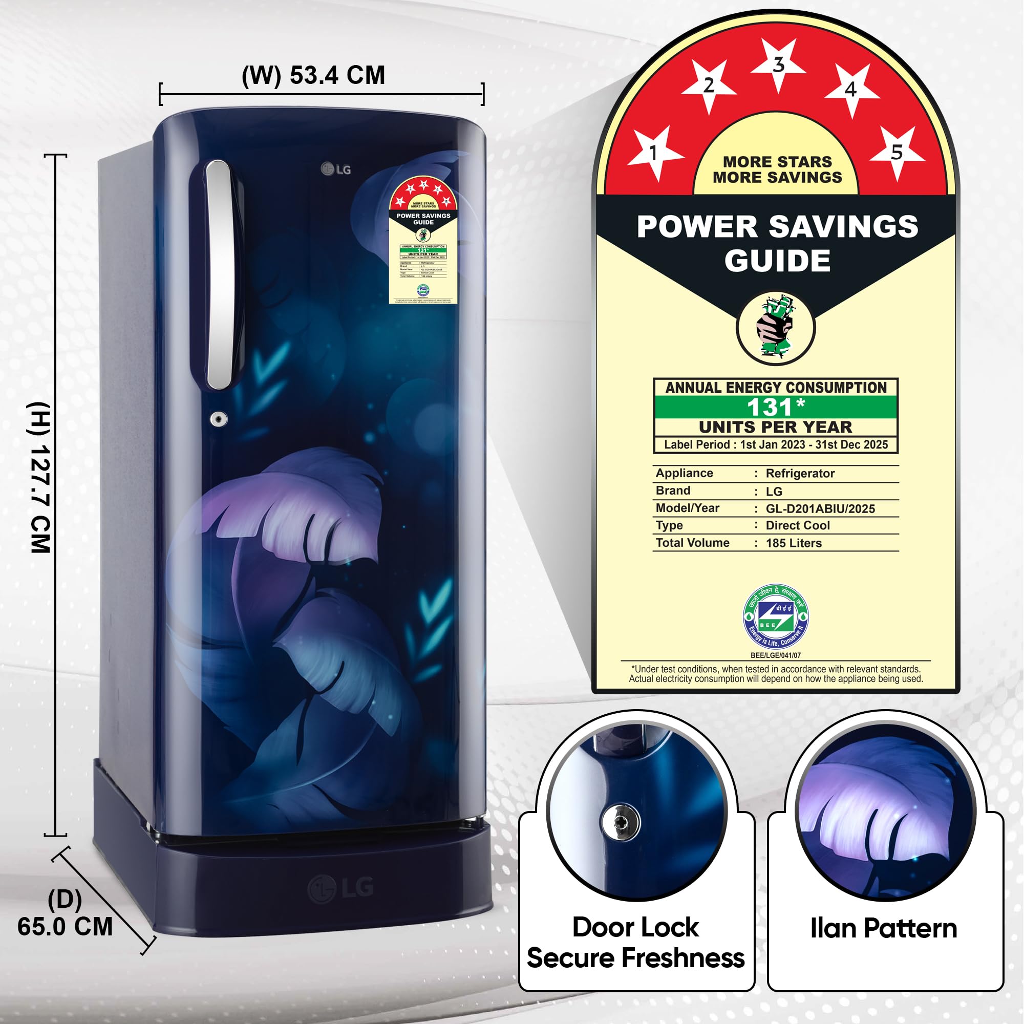 LG 185 L, 5 Star, Smart Inverter Compressor, Direct Cool Single Door Refrigerator (GL-D201ABIU.BBIZEBN, Blue ILAN, Moist N Fresh, Auto Smart Connect & Base Stand Drawer)