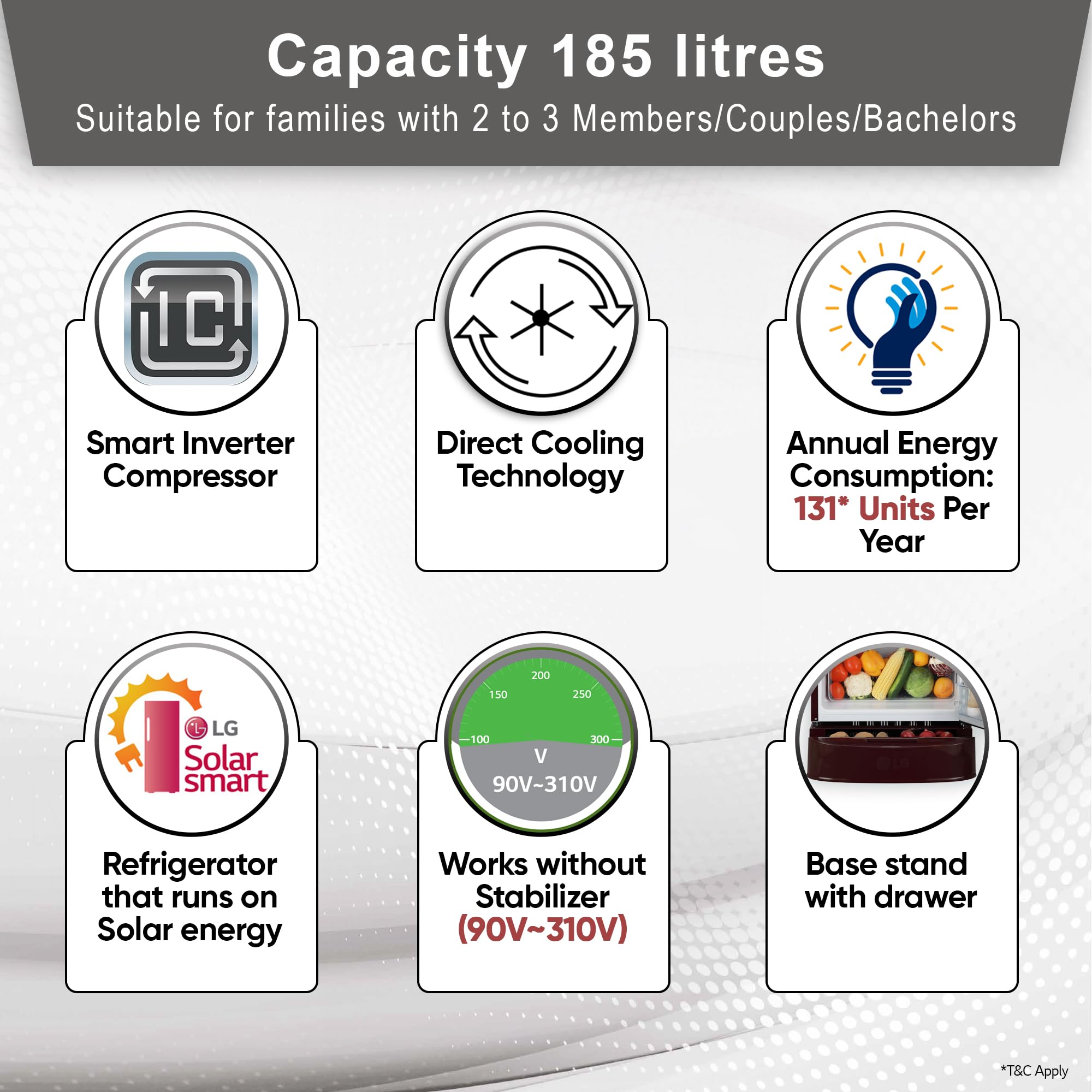 LG 185 L, 5 Star, Smart Inverter, Direct-Cool Single Door Refrigerator (GL-D201ASCU.BSCZEBN, Scarlet Charm, Base stand with drawer & Fast Ice Making)