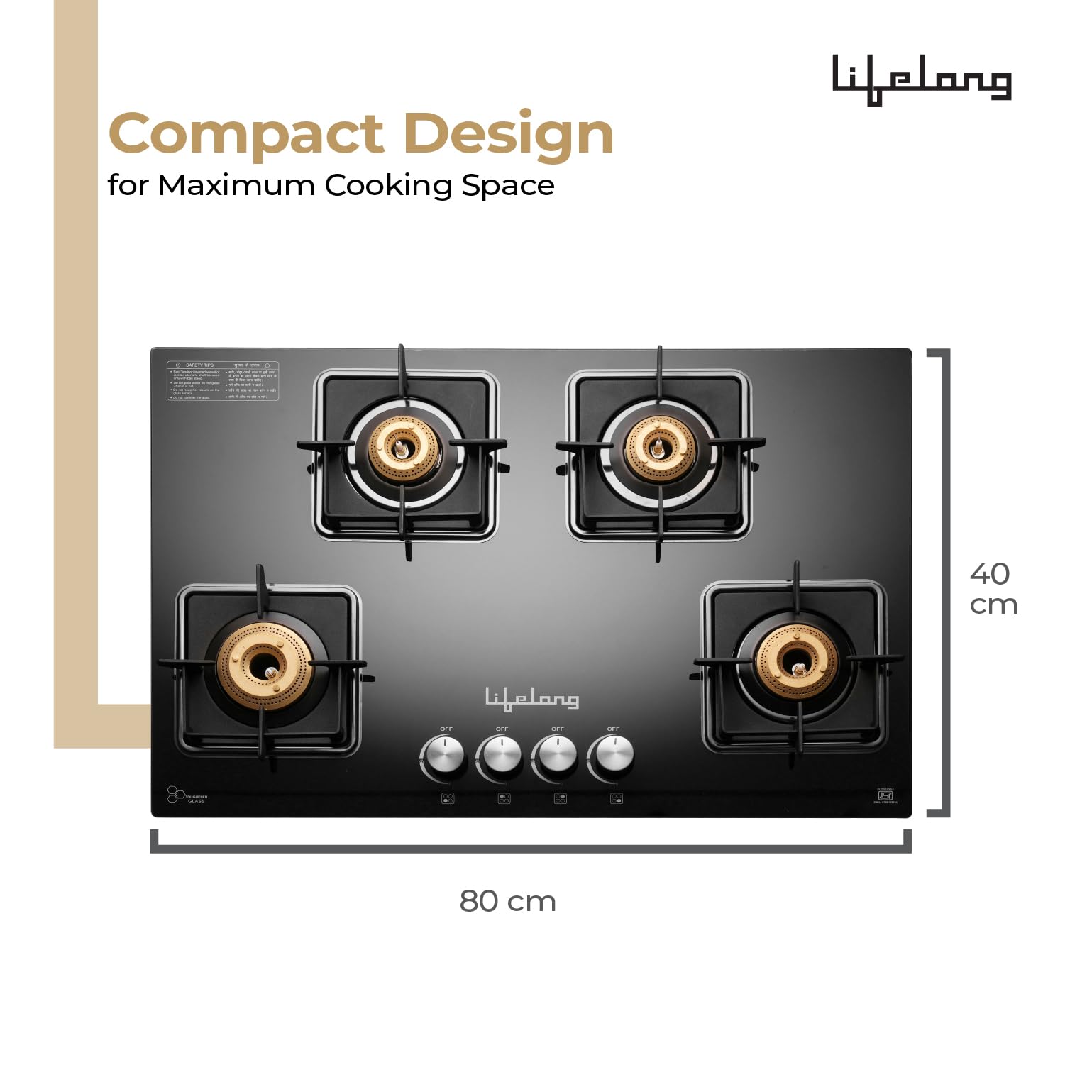 Lifelong 4 Gas Burner Tops - 4 Burners Hob Top Gas Stove with Automatic Ignition - Toughened Glass Top Gas Stoves for Home & Kitchen - Automatic Gas Stove for Modular Kitchen (LLHT008)