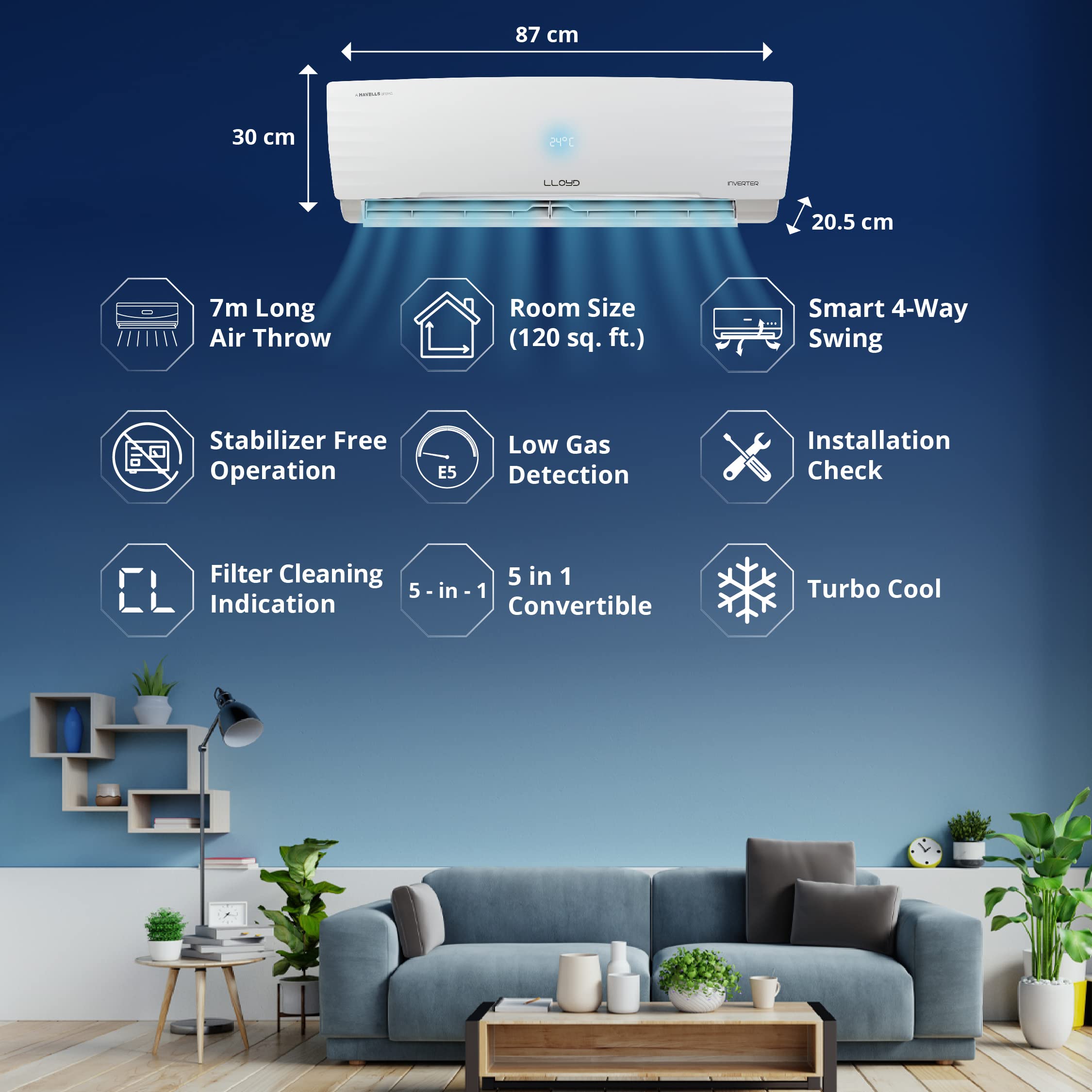 Lloyd 1 Ton 5 Star Inverter Split AC (5 in 1 Convertible, 100% Copper, Anti-Viral + PM 2.5 Filter, 2023 Model, White with Graphic Design,) (GLS12I5FWBEV)