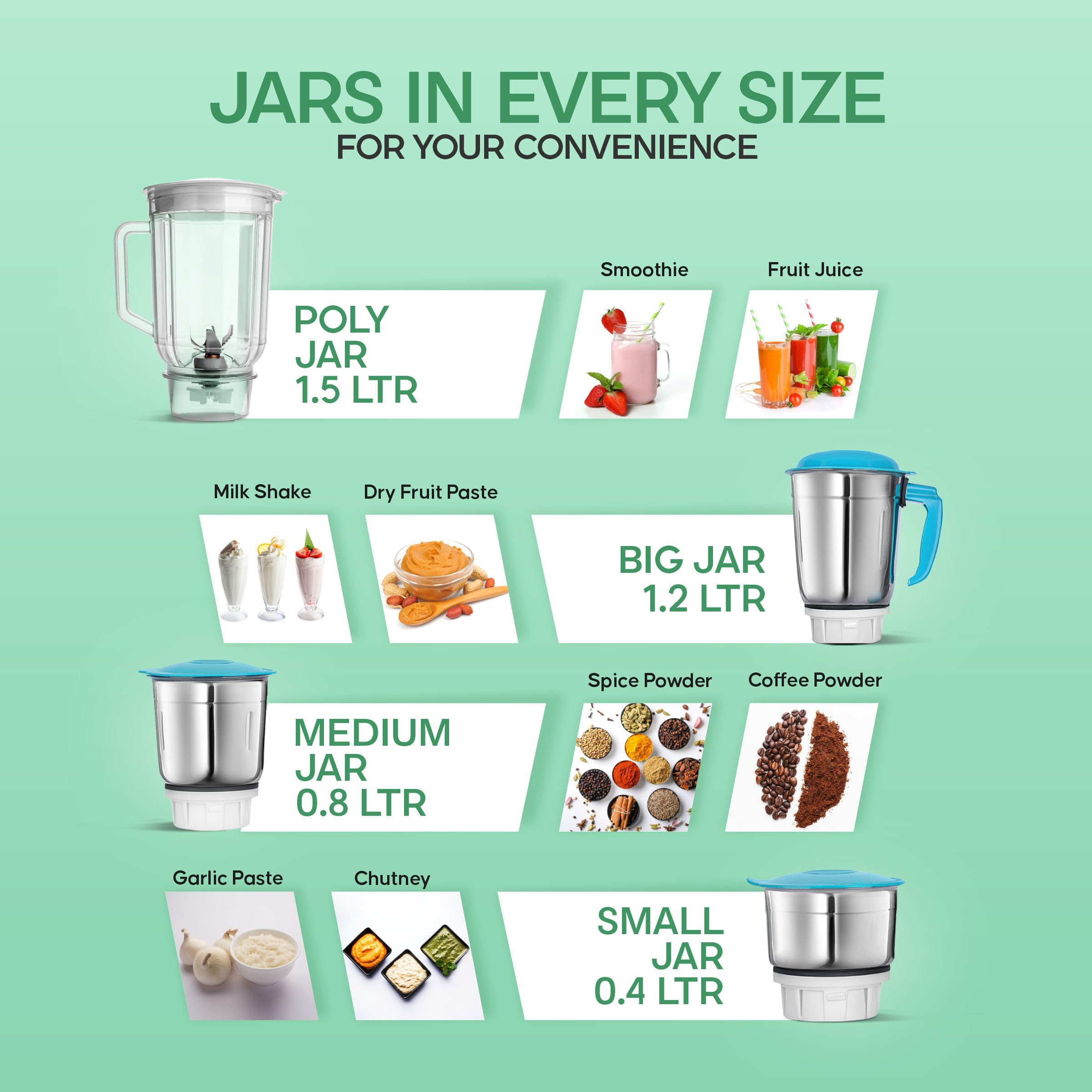 Longway Super Dlx 750 Watt Juicer Mixer Grinder with 4 Jars for Grinding, Mixing, Juicing with Powerful Motor | 2 Years Warranty | (White & Blue, 4 Jars)