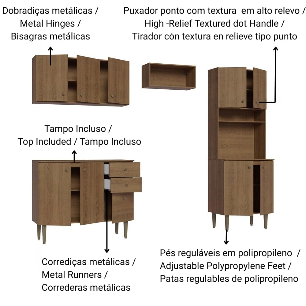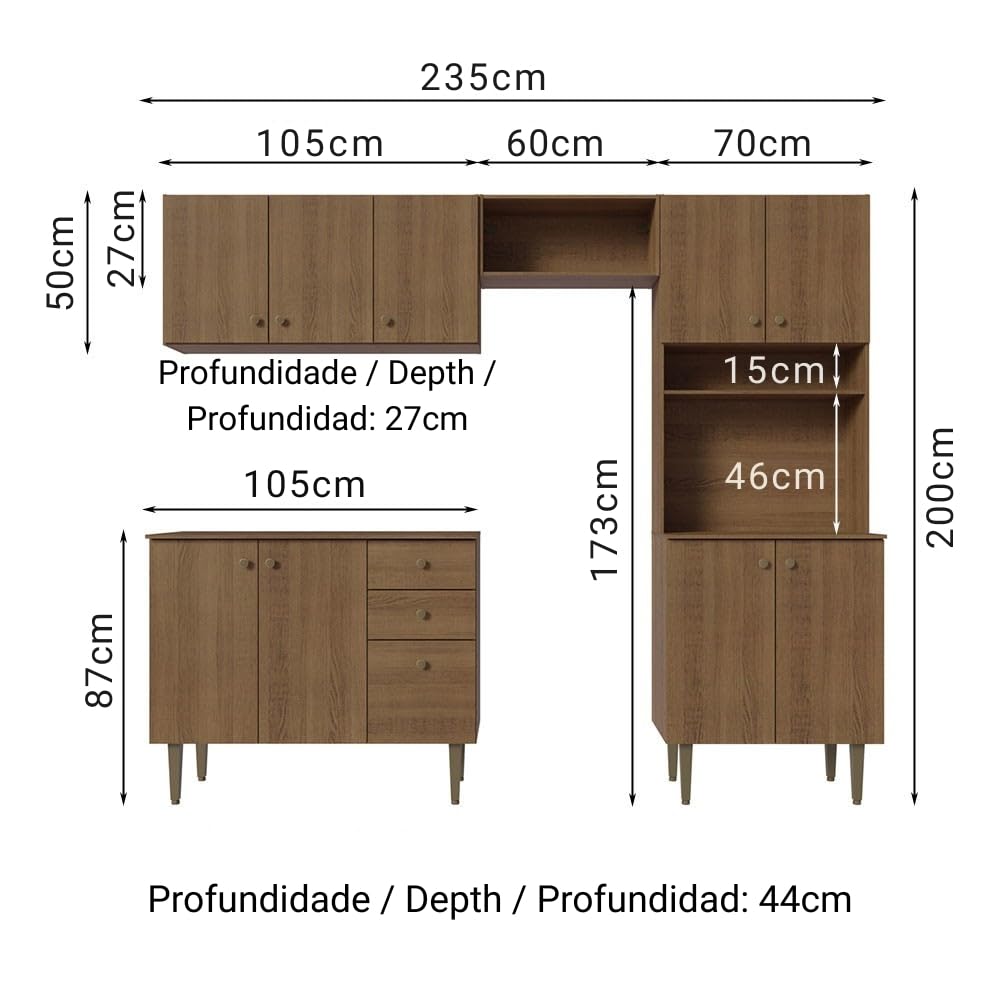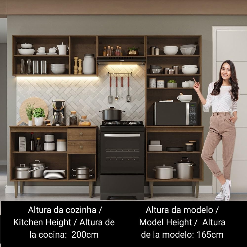 Details: The Madesa Gourmet Compact Kitchen is a smart choice for those seeking comfort, practicality, and elegance in their daily kitchen routine, offering a welcoming and highly functional space. Crafted from premium materials, it features durable metal runners and hinges, refined textured dot-style handles, and height-adjustable feet made from recycled materials, allowing for proper levelling across various surfaces while supporting eco-conscious living. Designed to enhance storage, the kitchen includes generous space for utensils, crockery, and appliances, with a dedicated compartment for a microwave or oven to streamline your everyday tasks. Its sophisticated Rustic wood finish is applied using an environmentally friendly polyester paint process. It emits no harmful vapours and provides resistance to moisture, heat, and wear, ensuring long-lasting beauty and protection. The aesthetic blends retro and modern elements for a timeless look that suits contemporary homes. Measuring 200 cm in height, 235 cm in width, with base units at 44 cm deep and wall cabinets at 27 cm, the set includes one 105 cm wall cabinet with three doors, one 105 cm base unit with three doors, two drawers and a worktop, one 60 cm wall unit with an open niche, and one tall unit with four doors and two open niches, complete with all assembly hardware and a step-by-step instruction manual for easy installation. Note: The product is delivered disassembled and will be assembled by the service partner. It includes an installation manual and all necessary hardware for assembly.