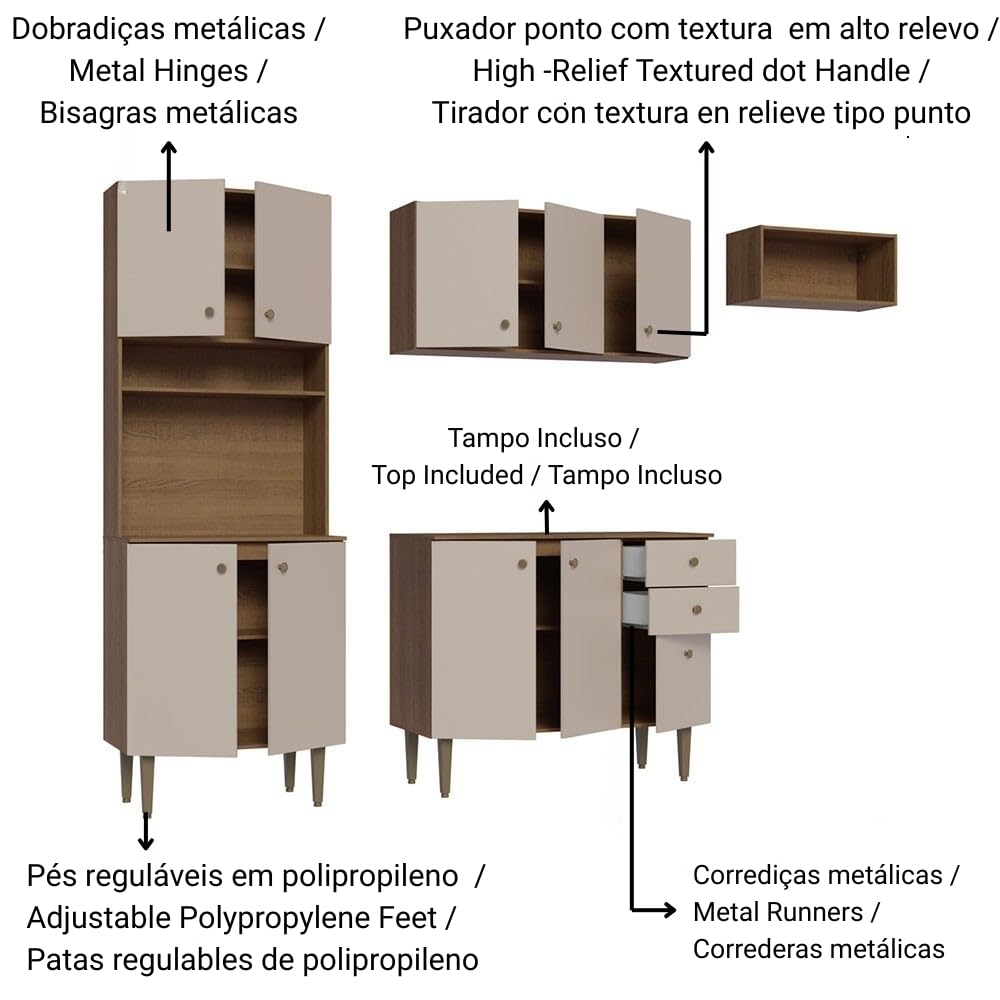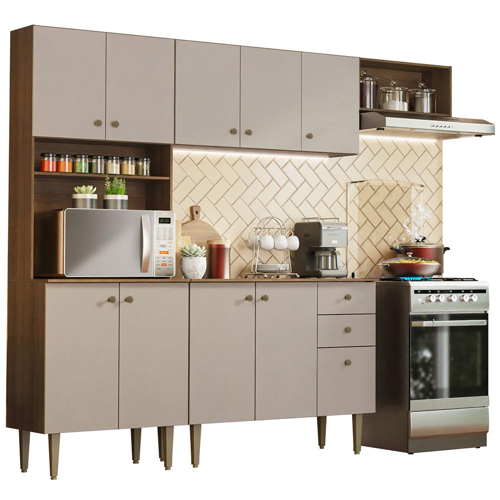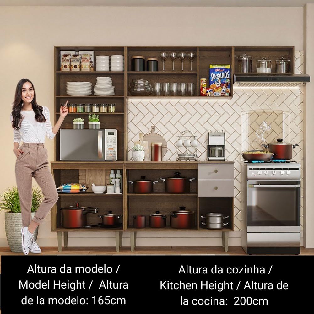 Details: The Madesa Gourmet Compact Kitchen is the perfect solution for those seeking a functional space without compromising on elegance, offering a seamless balance of comfort and style to make everyday kitchen tasks more pleasant and efficient. Built with high-quality materials, it features metal runners and hinges for enhanced durability, textured dot-style handles, and adjustable feet made from recycled materials, allowing for levelling on uneven surfaces while supporting sustainable practices. Its interior layout maximises storage capacity, with ample room for utensils, dishes, and appliances, including a dedicated space for a microwave or oven, promoting order and practicality. The Rustic wood tones are applied using an eco-friendly polyester paint process, which emits no harmful vapours and offers resistance against moisture, heat, and wear, while delivering a timeless and modern aesthetic. With total dimensions of 200 cm in height, 235 cm in width, 44 cm depth for the base units and 27 cm for the wall-mounted cabinets, the set includes one tall unit with four doors and two open niches, one 105 cm wall cabinet with three doors, one 105 cm base unit with three doors, two drawers and countertop, and one 60 cm wall cabinet with an open niche—all supplied with installation hardware and a comprehensive instruction manual for easy and secure assembly. Note: The product is delivered disassembled and will be assembled by the service partner. It includes an installation manual and all necessary hardware for assembly.