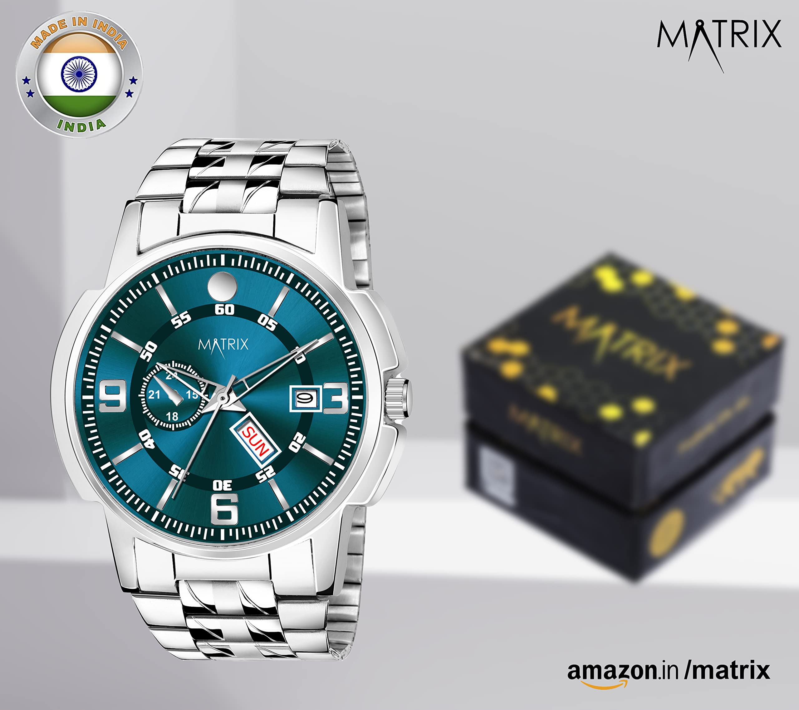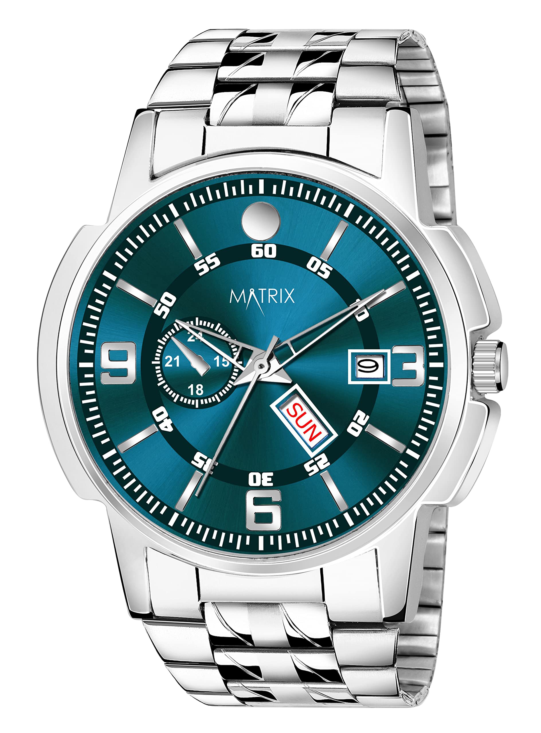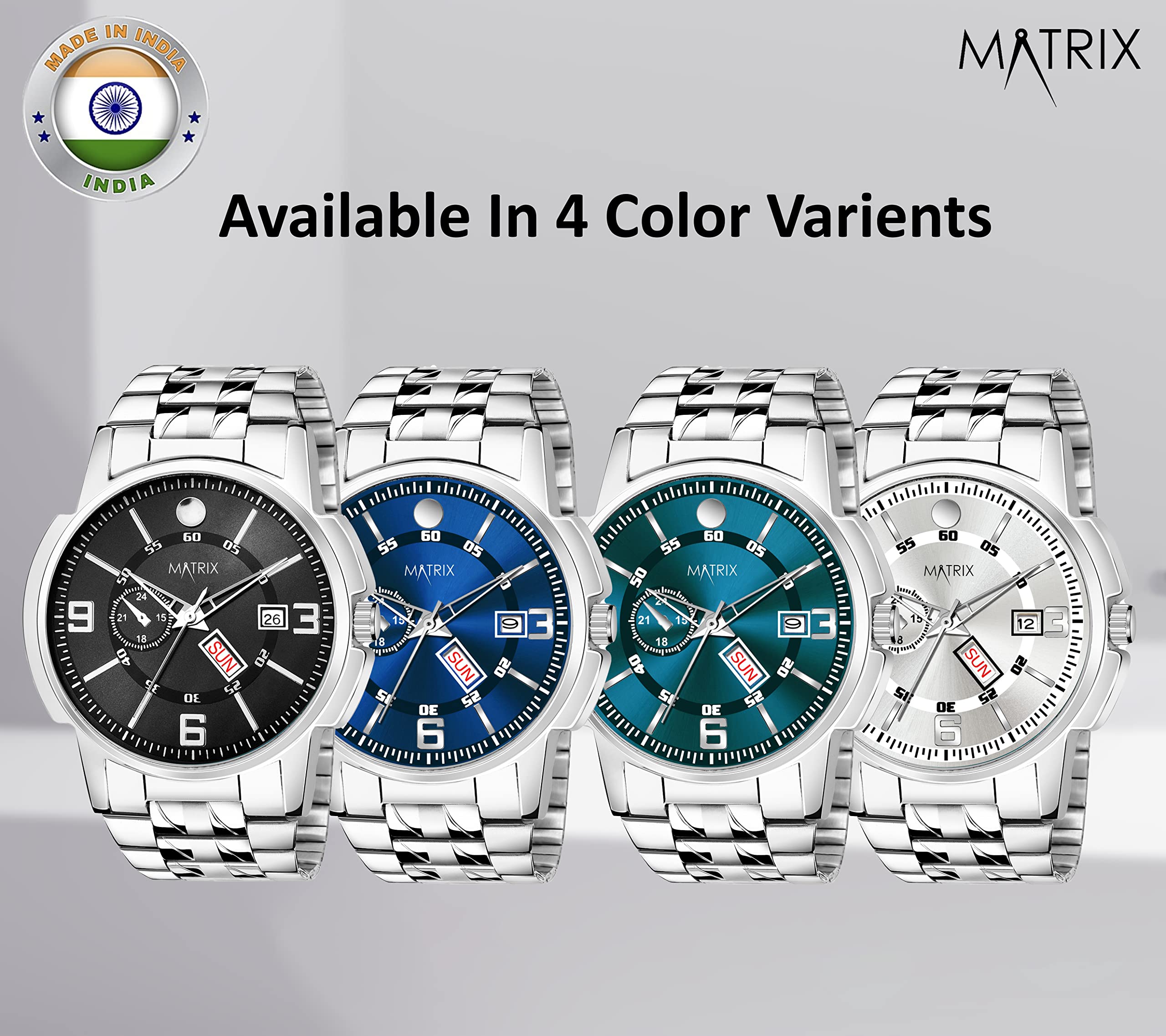 Matrix Black, Blue, White Dial, Day & Date Functioning, Stainless Steel Strap Analog Watch for Men & Women (Green)