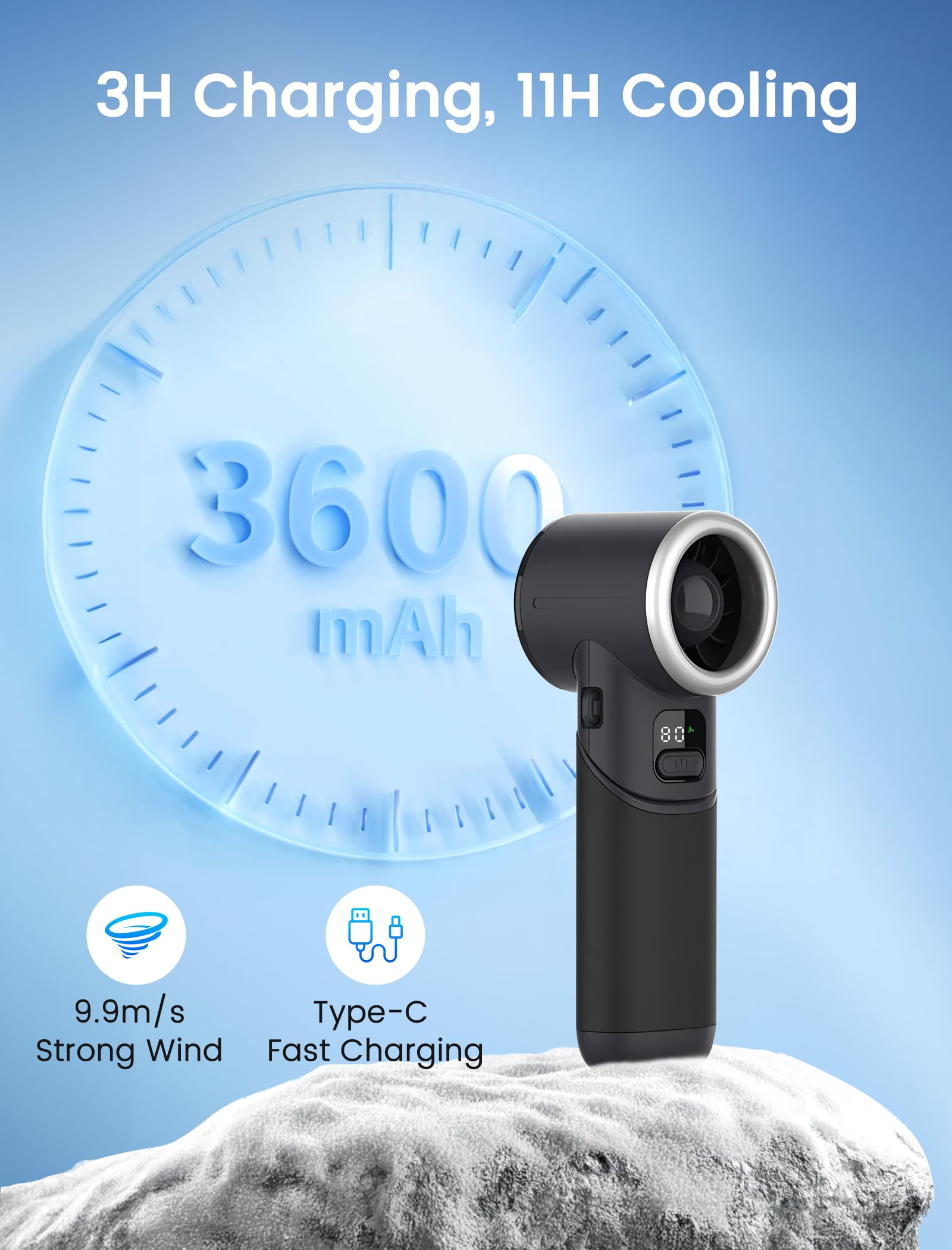 • 【11H Long-Lasting Cooling Experience】Built-in 3600mAh high-quality battery, the rechargeable hand fan can run continuously for up to 11 hours at the speed 1, providing you with a steady stream of coolness. At the same time, you can easily recharge it using the included USB Type-C cable via USB adapter, laptop, power bank, or car charger. (Full charge takes only 3h.)