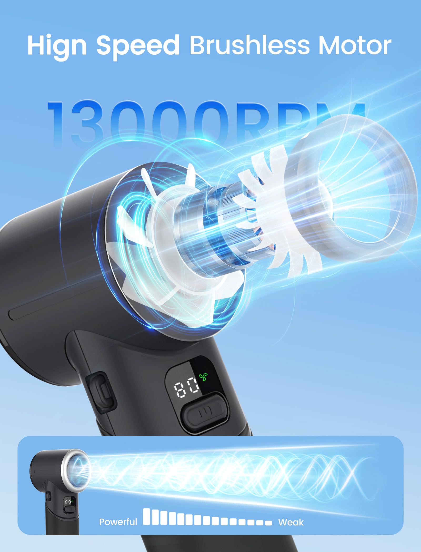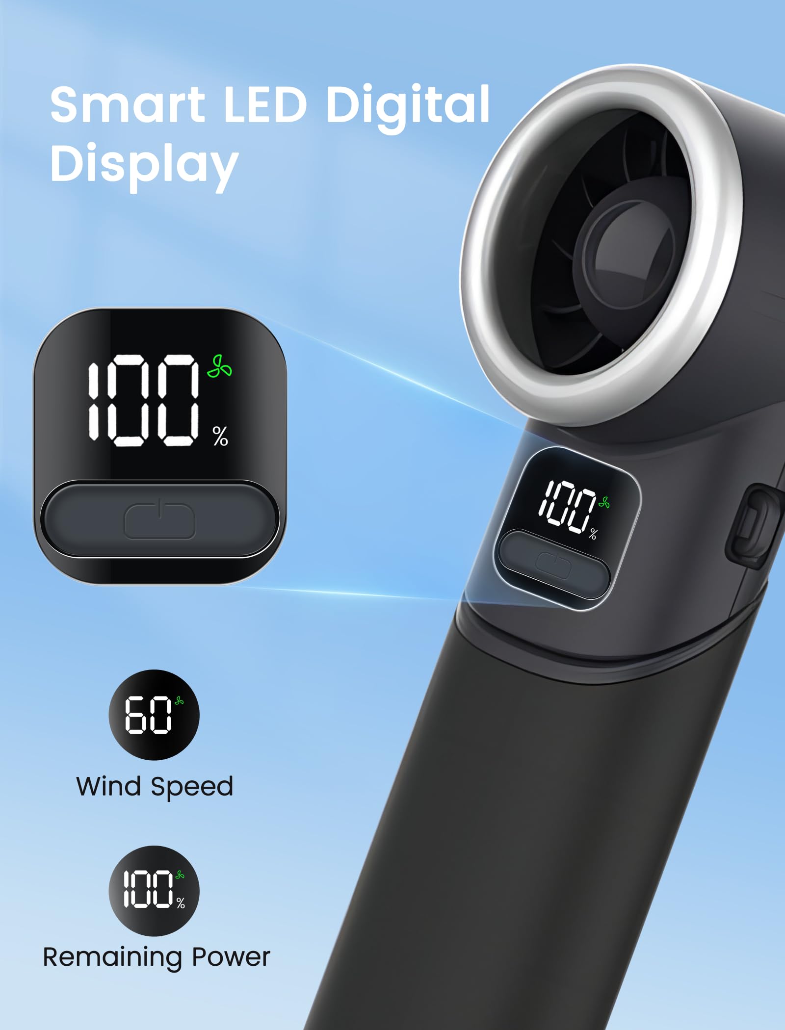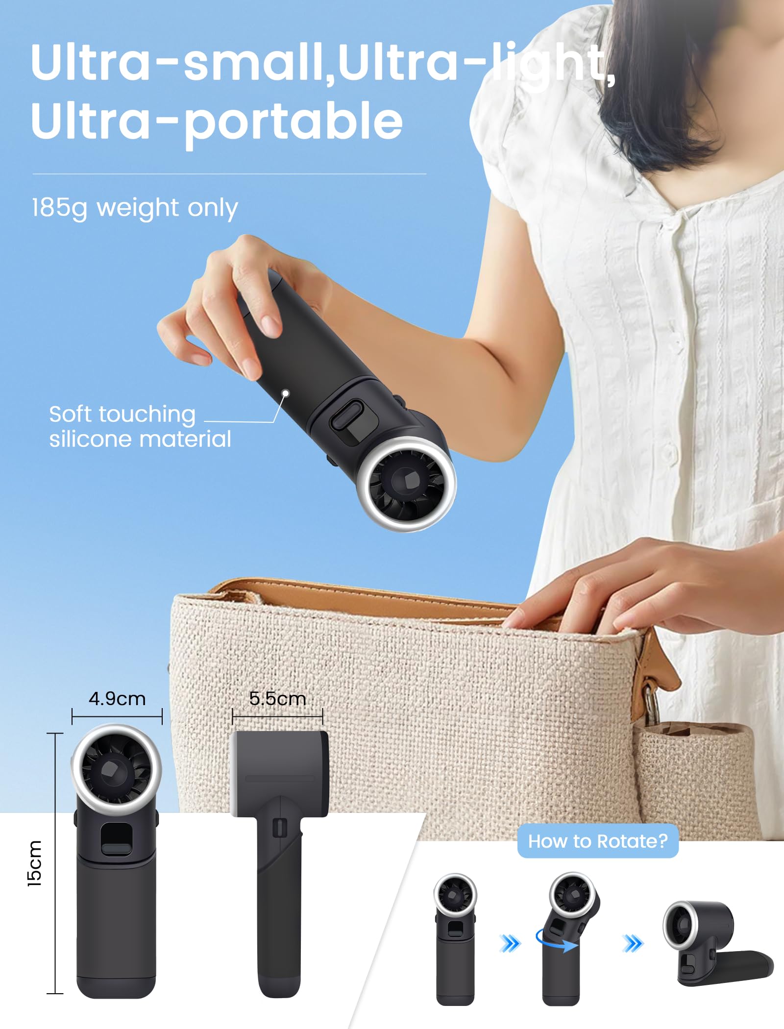 • 【Brushless Motor, Super Strong Wind】The portable handheld fan features a turbocharged structure and is equipped with powerful brushless pure copper motor. With fan blades that reach up to 13,000 RPM, it maximizes airflow intensity, quickly compressing and cooling the inhaled hot air, then turn it into strong cool breeze to quickly dispel the heat in the hot summer.